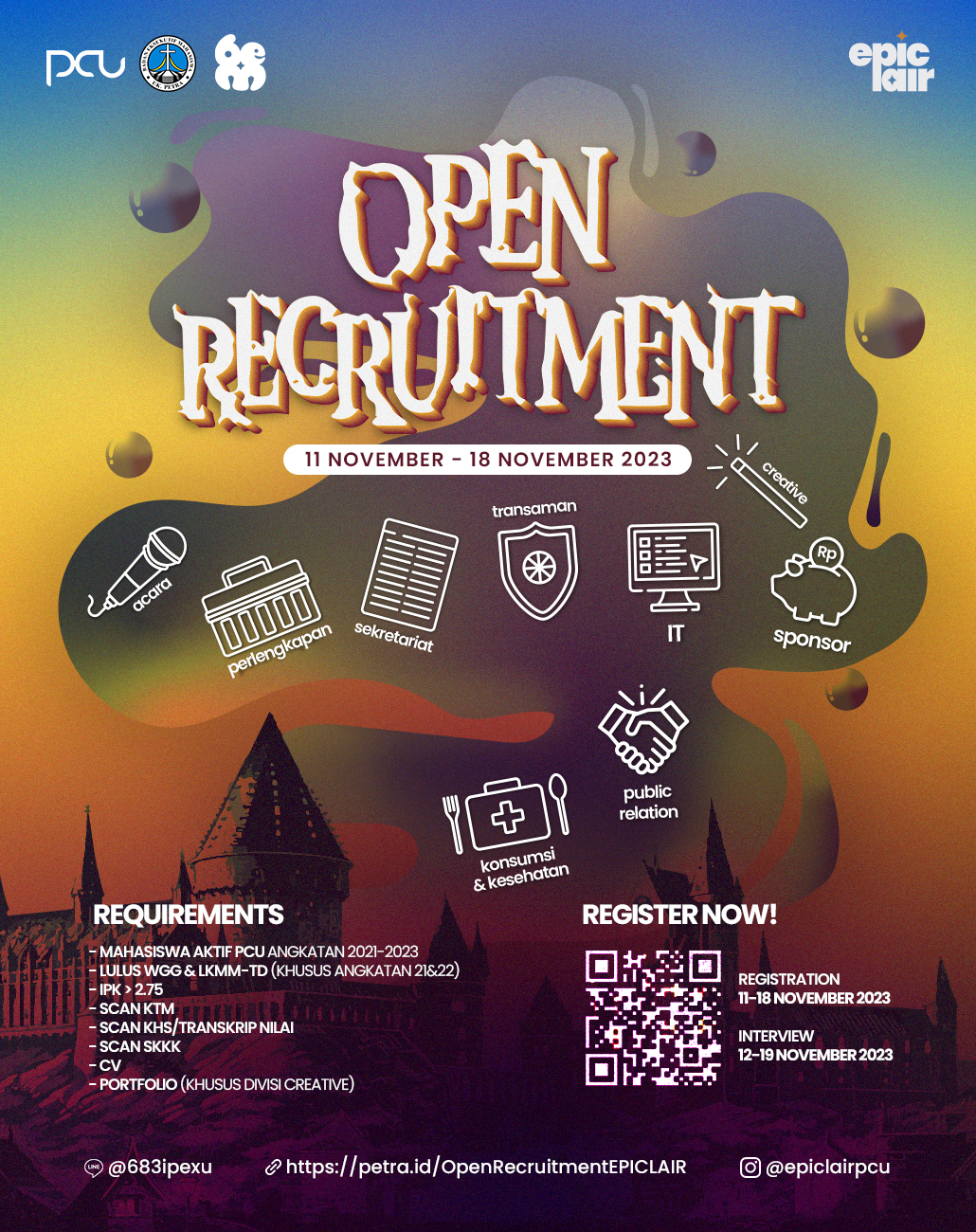 BEM Universitas Kristen Petra Surabaya membuka kesempatan untuk menjadi panitia acara EPICLAIR. Event ini merupakan rebranding dari PCUNIVERS, dan merupakan dibawah naungan BEM Bidang 1. Pendaftaran panitia dibuka pada tanggal 11 - 18 November 2023.