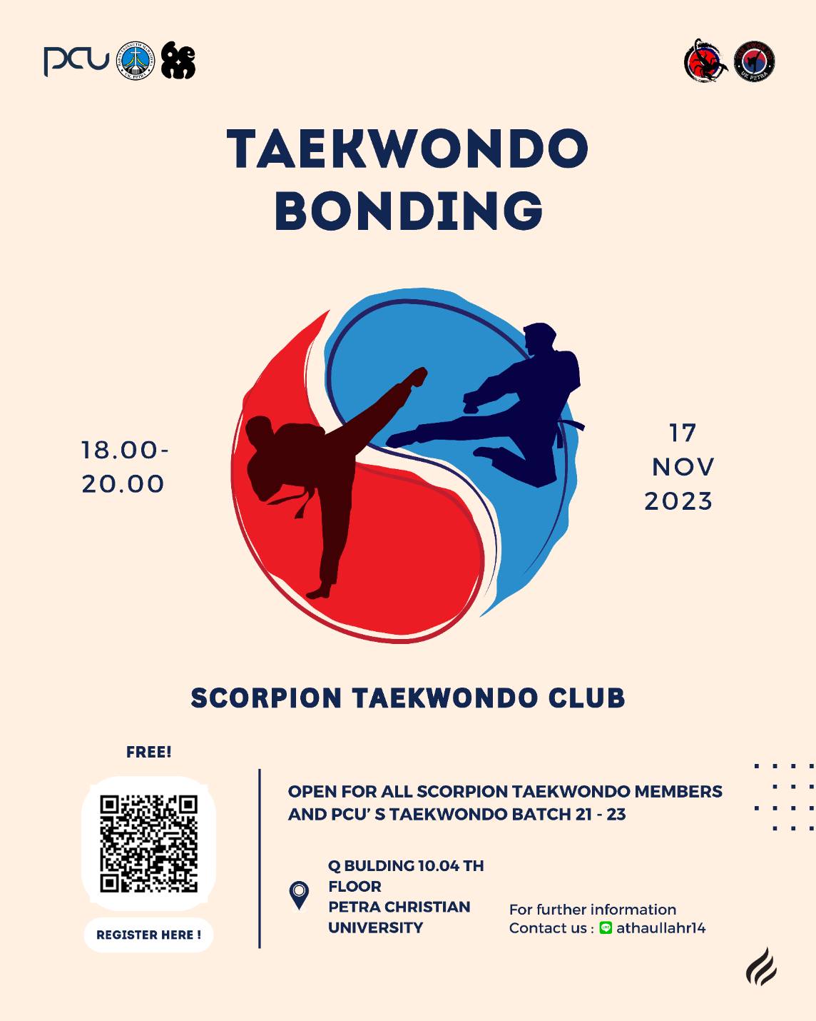 Kegiatan Bonding Taekwondo Dojang Scorpion Petra dilaksanakan pada tanggal 17 November 2023 jam 18.00 - 20.00 WIB. Bertempat di Gedung Q lantai 10.