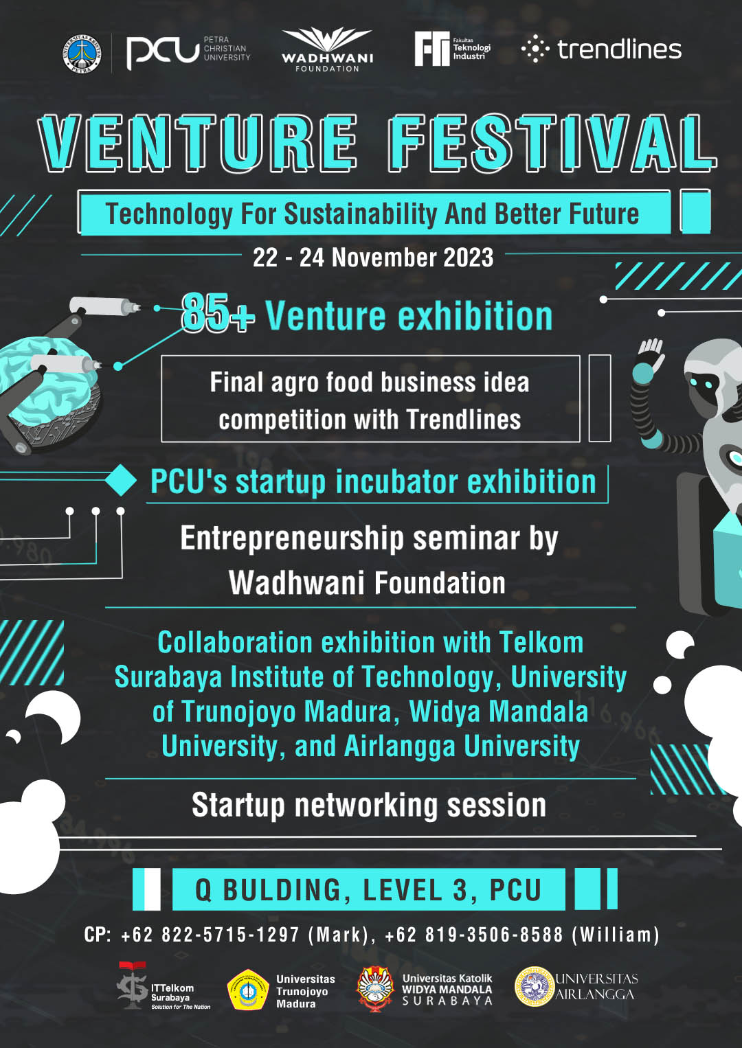Sebagai bagian akhir dari proses pembelajaran kelas Technopreneurship, kelompok venture mahasiswa akan memamerkan ide mereka melalui poster, video pitching, dan prototipe pada acara Venture Festifal 2023. Pada kesempatan ini akan ada 64 venture kelas Technopreneurship, 9 Startup binaan Sentra Inovasi dan Kewirausahaan (SIK) Petra Chrsitian University, dan 12 venture dari empat universitas di Surabaya dan sekitar yang juga menggunakan modul kewirausahaan Wadhwani.