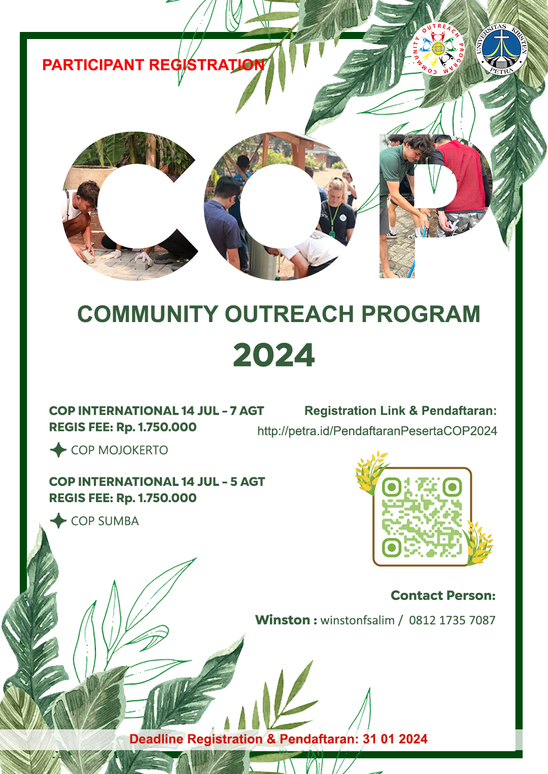 Community Outreach Program (COP) International 2024 membuka pendaftaran PANITIA dan PESERTA dengan jadual berikut: