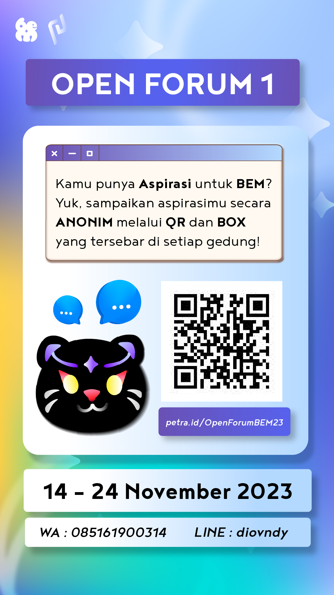Open Forum BEM adalah kegiatan rutin yang diselenggarakan oleh departemen RnD Bidang 2 BEM. Open Forum ini bertujuan untuk memberikan wadah bagi mahasiswa untuk menyampaikan aspirasinya ke BEM secara anonim. Mahasiswa dapat memberikan aspirasinya melalui online dengan scan qr code pada poster, atau melalui box yang tersebar di gedung T, W, P, dan Q. Dengan adanya open forum ini, diharapkan BEM dapat menjangkau dan menjawab berbagai kebutuhan mahasiswa dengan efektif, serta memberikan ruang bagi mahasiswa untuk membagikan aspirasinya untuk pengembangan BEM kedepannya. Kegiatan ini diselenggarakan pada 14 - 24 November 2023.