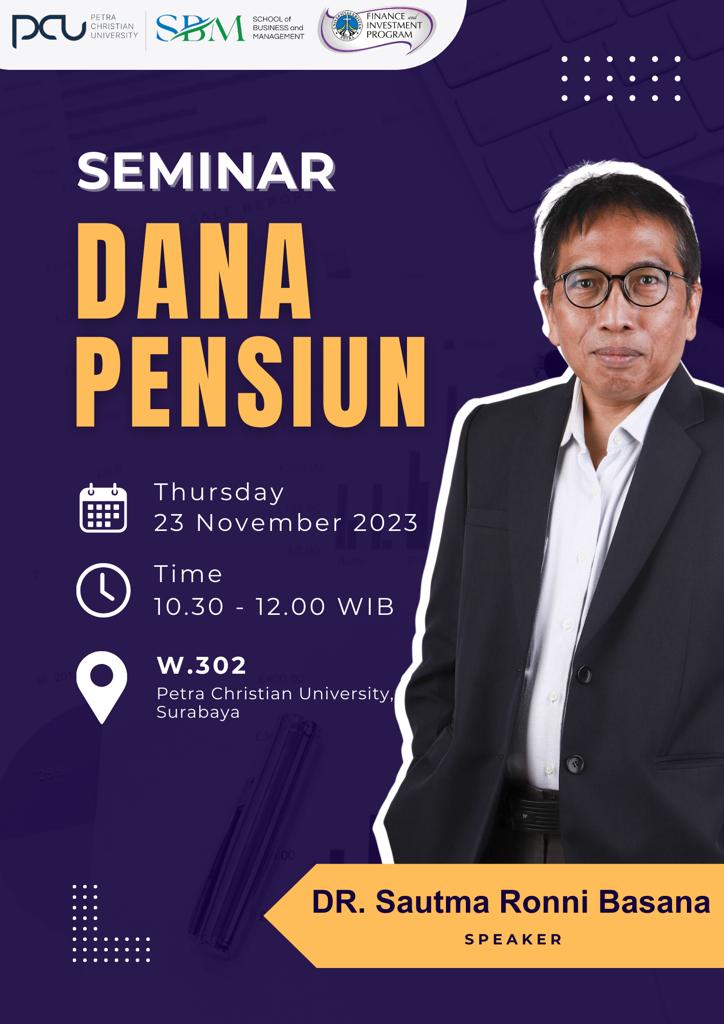 Seminar dengan topik Dana Pensiun, dengan tujuan: 1. Mahasiswa memahami konsep dasar Dana Pensiun. 2. Mahasiswa memahami jenis-jenis Dana Pensiun. 3. Mahasiswa mampu mengidentifikasi tantangan dan peluang di bidang Dana Pensiun. Diselenggarakan oleh Program Manajemen Keuangan Universitas Kristen Petra Surabaya pada tanggal 23 November 2023 dengan narasumber DR. Sautma Ronni Basana