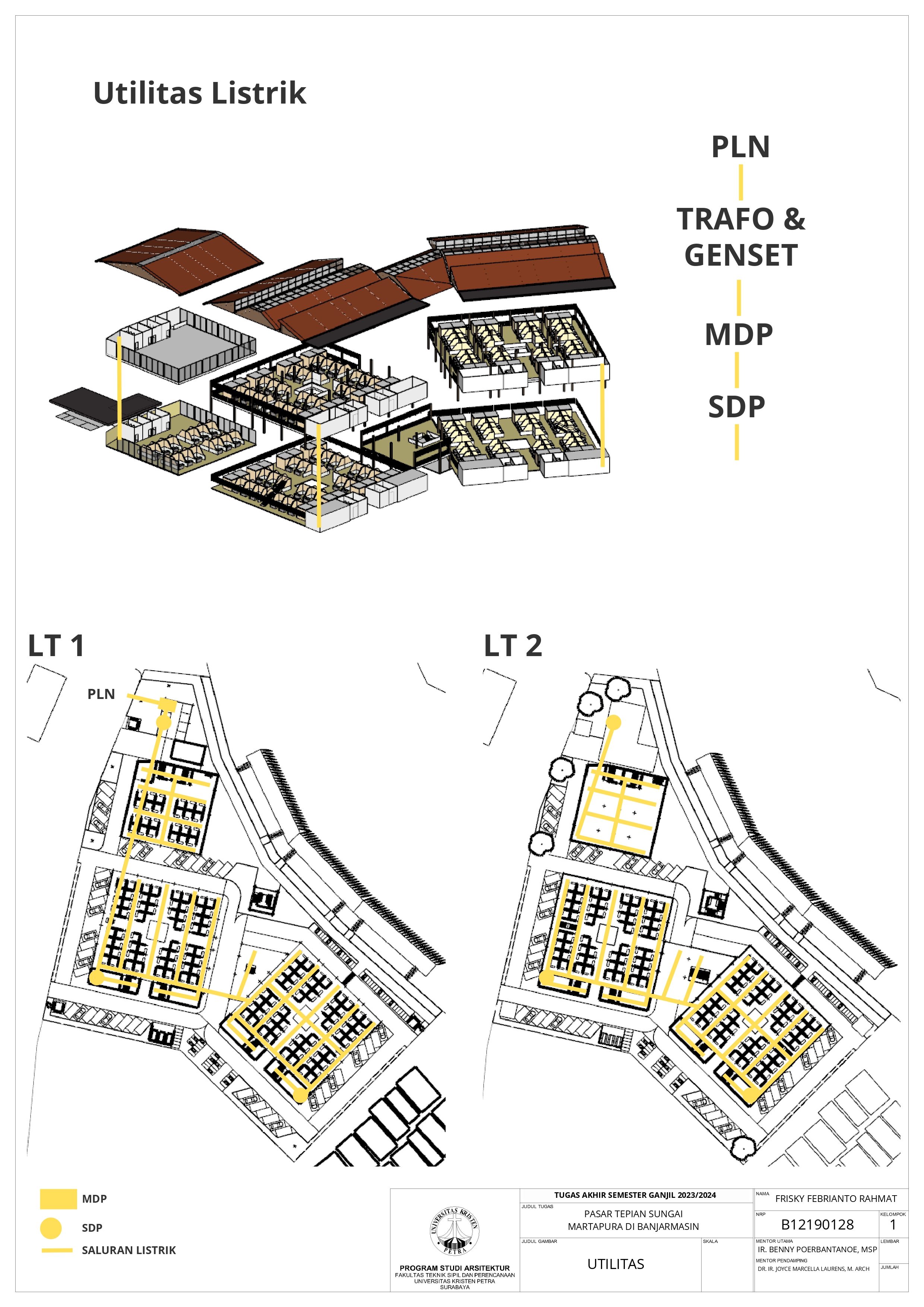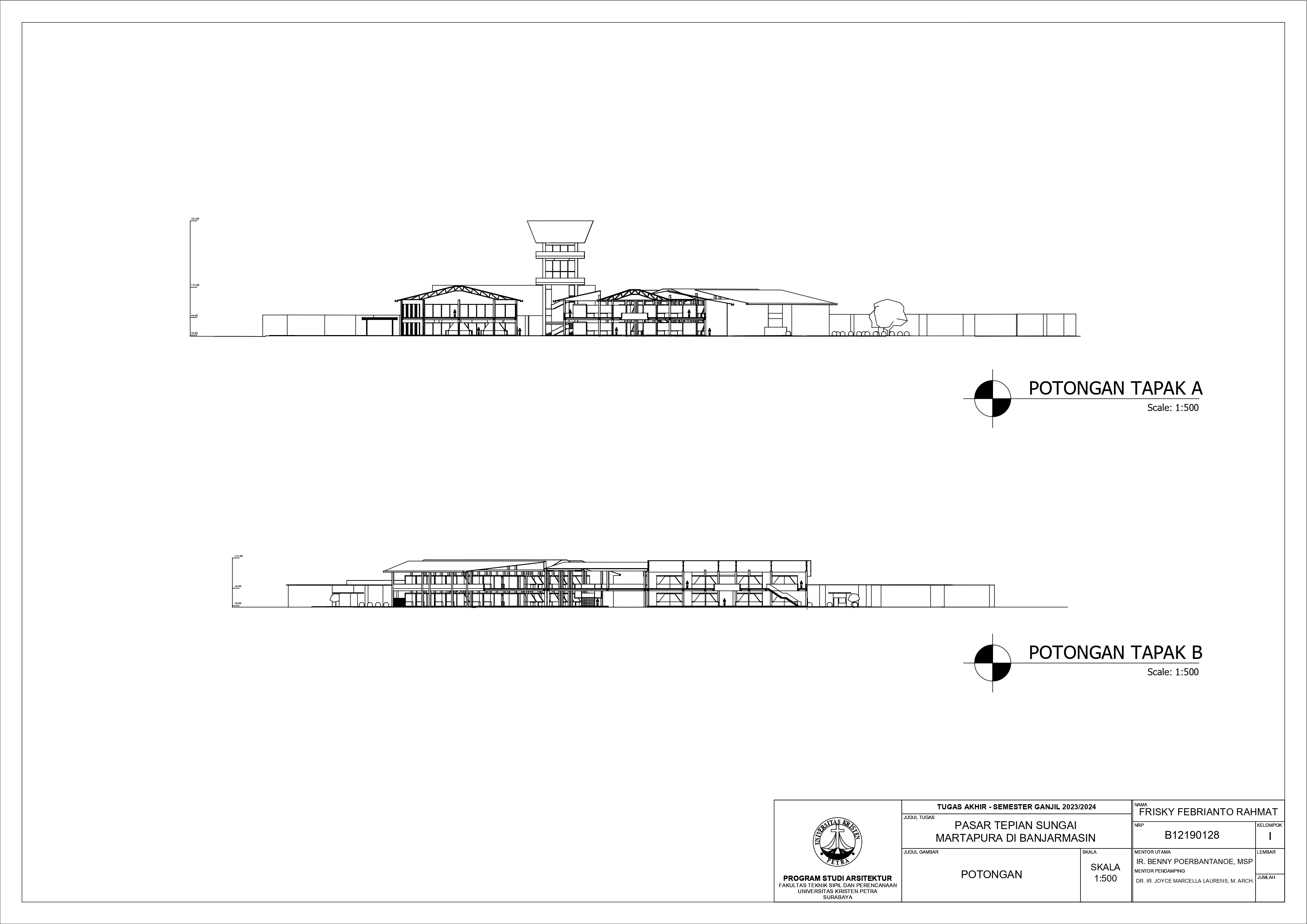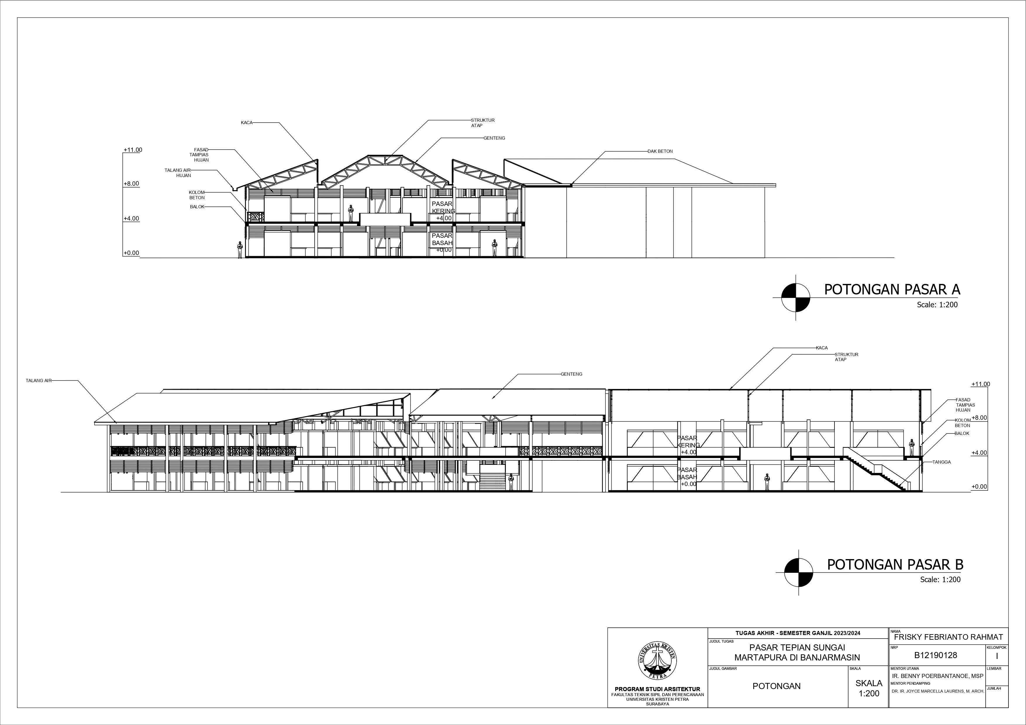 Pasar Tradisional di Banjarmasin saat ini ada 2 yaitu Pasar Tradisional di darat dan Pasar Terapung. Pasar Tradisional di darat saat ini masih kumuh, sempit, dan kurang tertata dengan baik dan juga Pasar Terapung saat ini masih kurang aman dan nyaman selain itu Pasar Terapung saat ini menjadi objek wisata di Banjarmasin. Maka dari itu Pasar Tepian Sungai Martapura ini dibutuhkan untuk menggabungkan Pasar Tradisional di darat dan Pasar Terapung agar menciptakan area Tepian Sungai yang menarik dan menjadi ikon di Banjarmasin. Untuk mendukung area Tepian Sungai ada juga fasilitas pendukung tempat makan untuk menikmati tepian Sungai dan Tower Air dengan ketinggian 21-meter yang memungkinkan diakses pengunjung untuk dapat menikmati view Sungai dari atas tower air. Pasar Tradisional yang ada di zoning secara vertical dari yang basah di lantai 1 dan kering di lantai 2, bentuk bangunan menyesuaikan modul dari kios yang tersusun berpola.