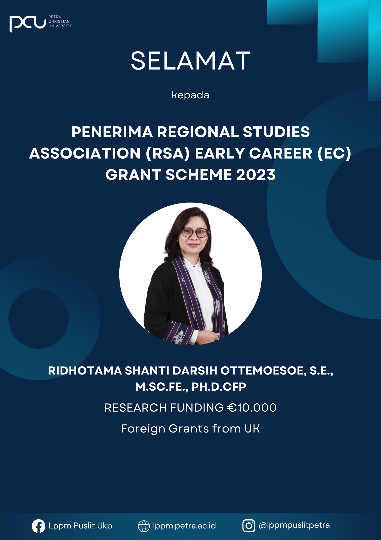 Selamat kepada penerima regional studies association (RSA) early career (EC) grant scheme 2023. Yang diterima oleh Ridhotama Shanti Darsih Ottemoesoe, Ph.D.