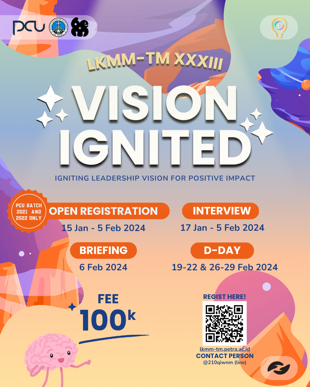 Badan Eksekutif Mahasiswa UK Petra, mengadakan pelatihan LKMM-TM XXXIII: vision ignited. Acara ini diselenggarakan pada 19-22 dan 26-29 Februari 2024.