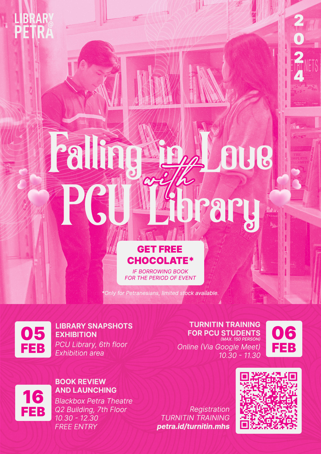 Di semester yang baru ini, Perpustakaan PCU ingin membuat Petranesians lebih jatuh cinta lagi dengan perpustakaan. Dapatkan Cokelat gratis bagi Petranesians yang melakukan peminjaman buku pada periode kegiatan (stok terbatas). Kegiatan ini berlaku dari tanggal 5-16 Februari 2024.