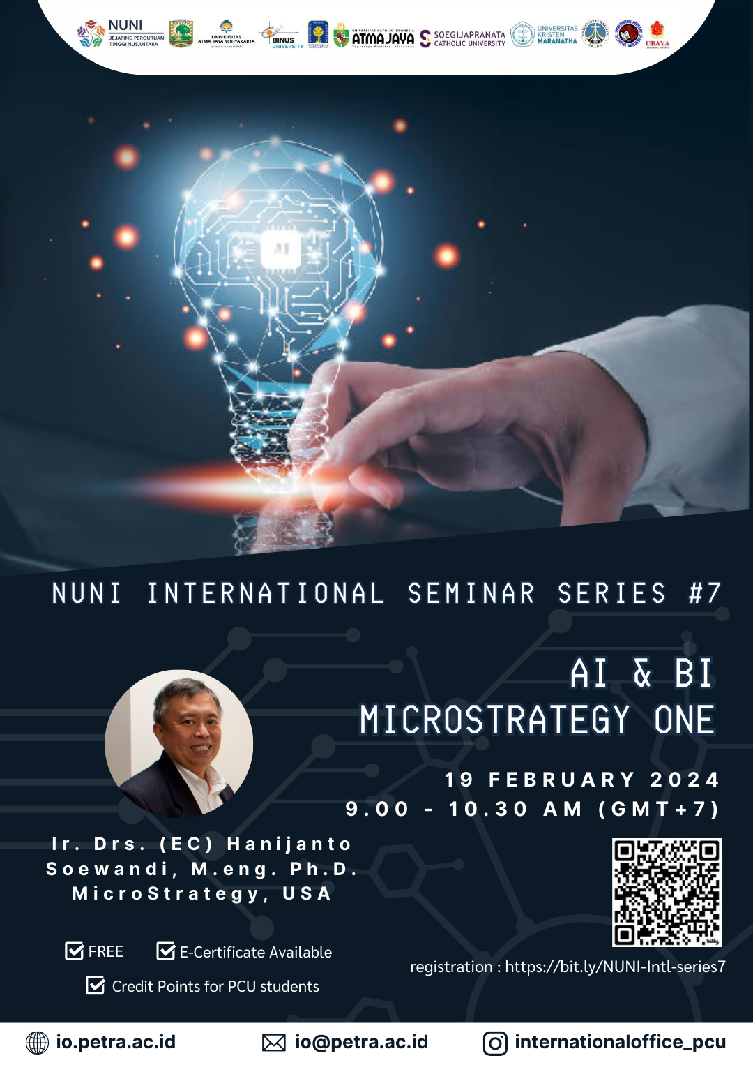 NUNI International Seminar Series 7, diselenggarakan oleh UK Petra bekerja sama dengan beberapa universitas di Indonesia. Acara ini mengambil topik "AI and BI microstrategy one". Diselenggarakan pada tanggal 19 Februari 2024.