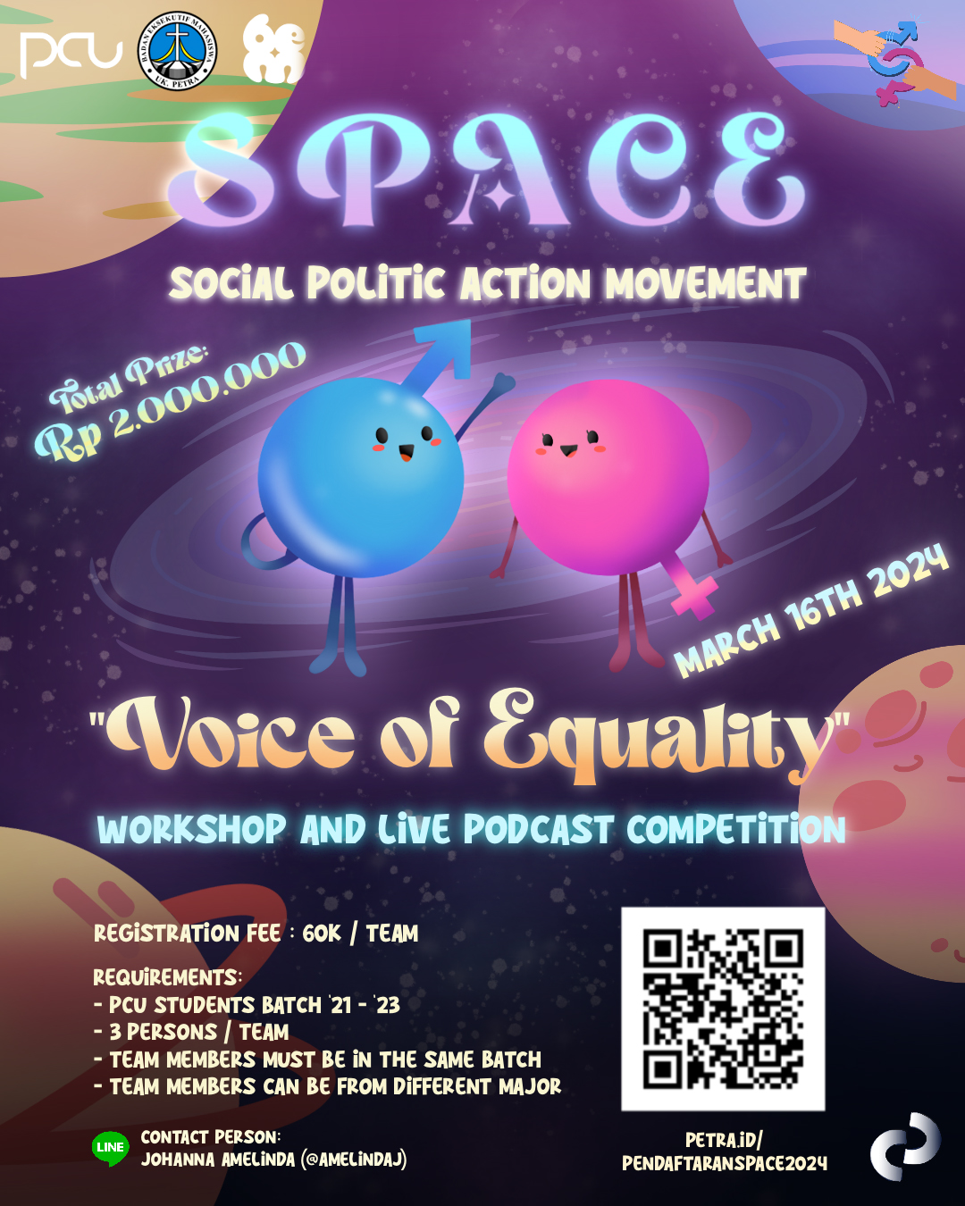 SPACE 2024 merupakan salah satu acara di bawah naungan BEM dengan bentuk kegiatan workshop dan live podcast competition. SPACE 2024 mengangkat tema "Voice of Equality" yang bertujuan mengajak mahasiswa menyuarakan kesetaraan gender.