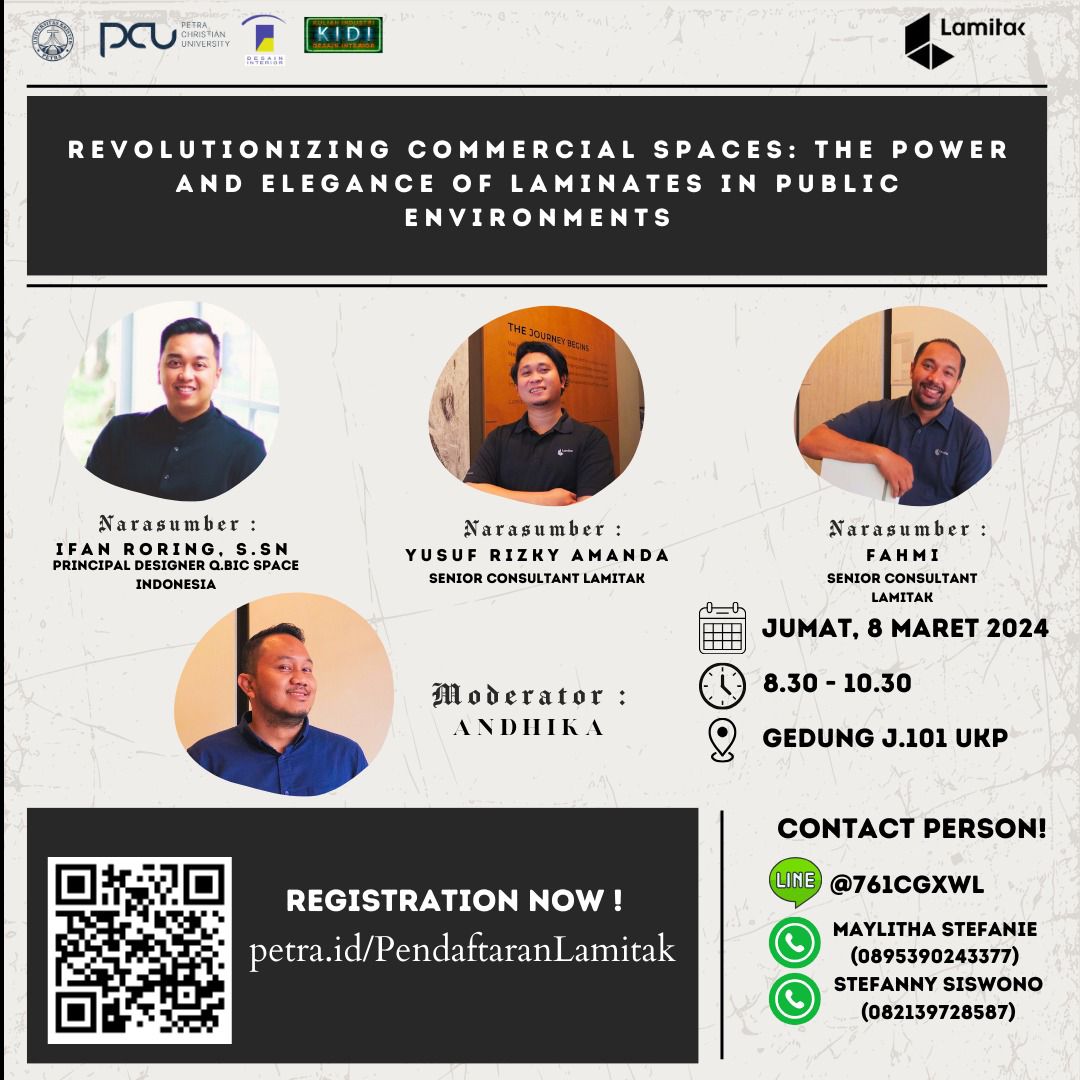 Pada Jumat, 08 Maret 2024 Program Studi Desain Interior Universitas Kristen Petra Surabaya mengadakan KIDI (Kuliah Industri Desain Interior) 2024. Dengan narasumber Ifan Roring, S.Sn. Yusuf Rizky Amanda, serta Fahmi KIDI 2024 ini mengangkat tema revolutionizing commercial spaces bertempat di J.101.