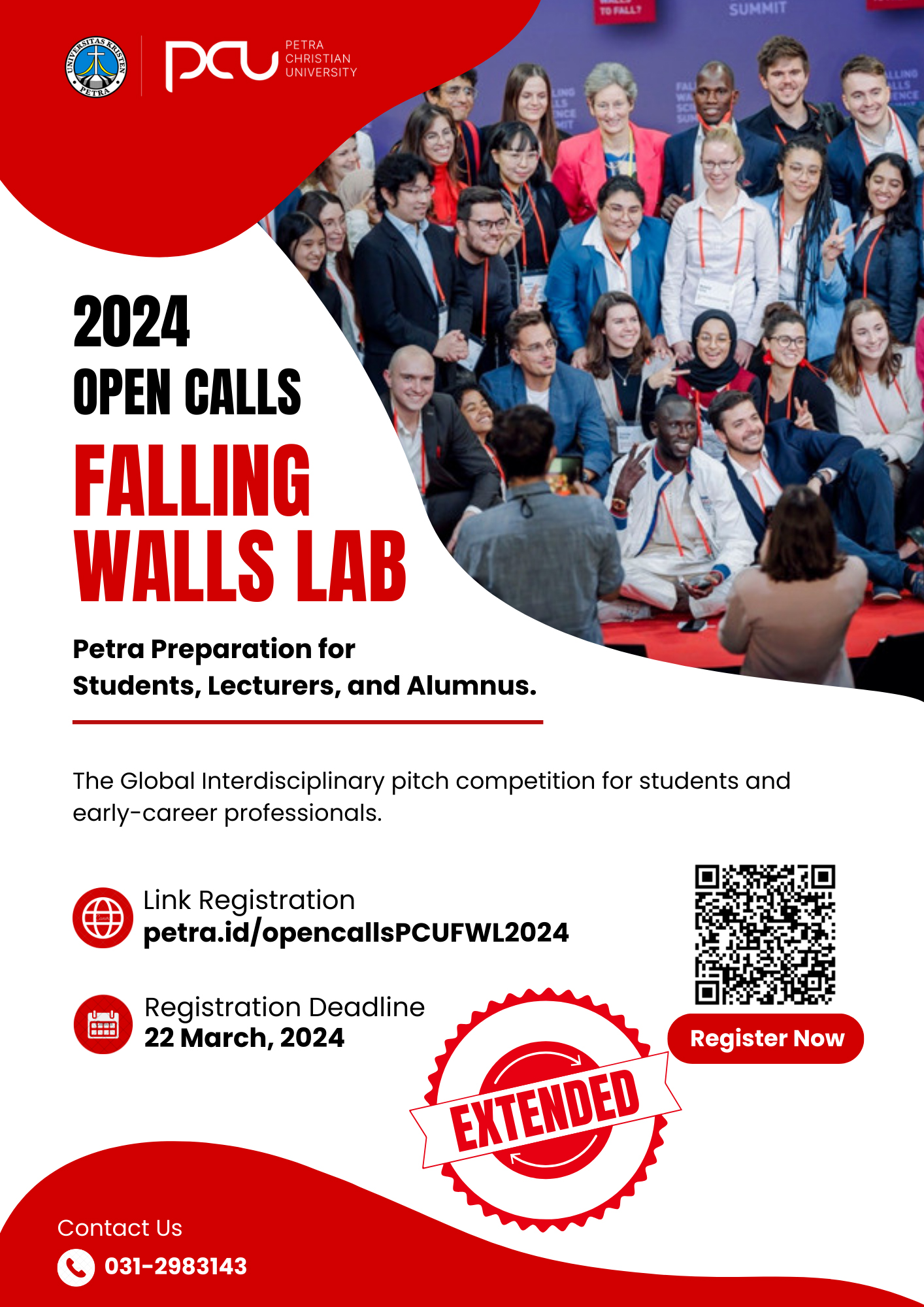 Open Calls Falling Walls Lab 2024 persiapan bagi Petra untuk mahasiswa, dosen, dan alumni. Falling Walls Lab adalah kompetisi penggagas ide inovasi interdisipliner global untuk mahasiswa dan profesional yang sedang dalam masa karir. Untuk deadline pendaftaran tanggal 22 Maret 2024. Link pendaftaran petra.id/opencallsPCUFWL2024
