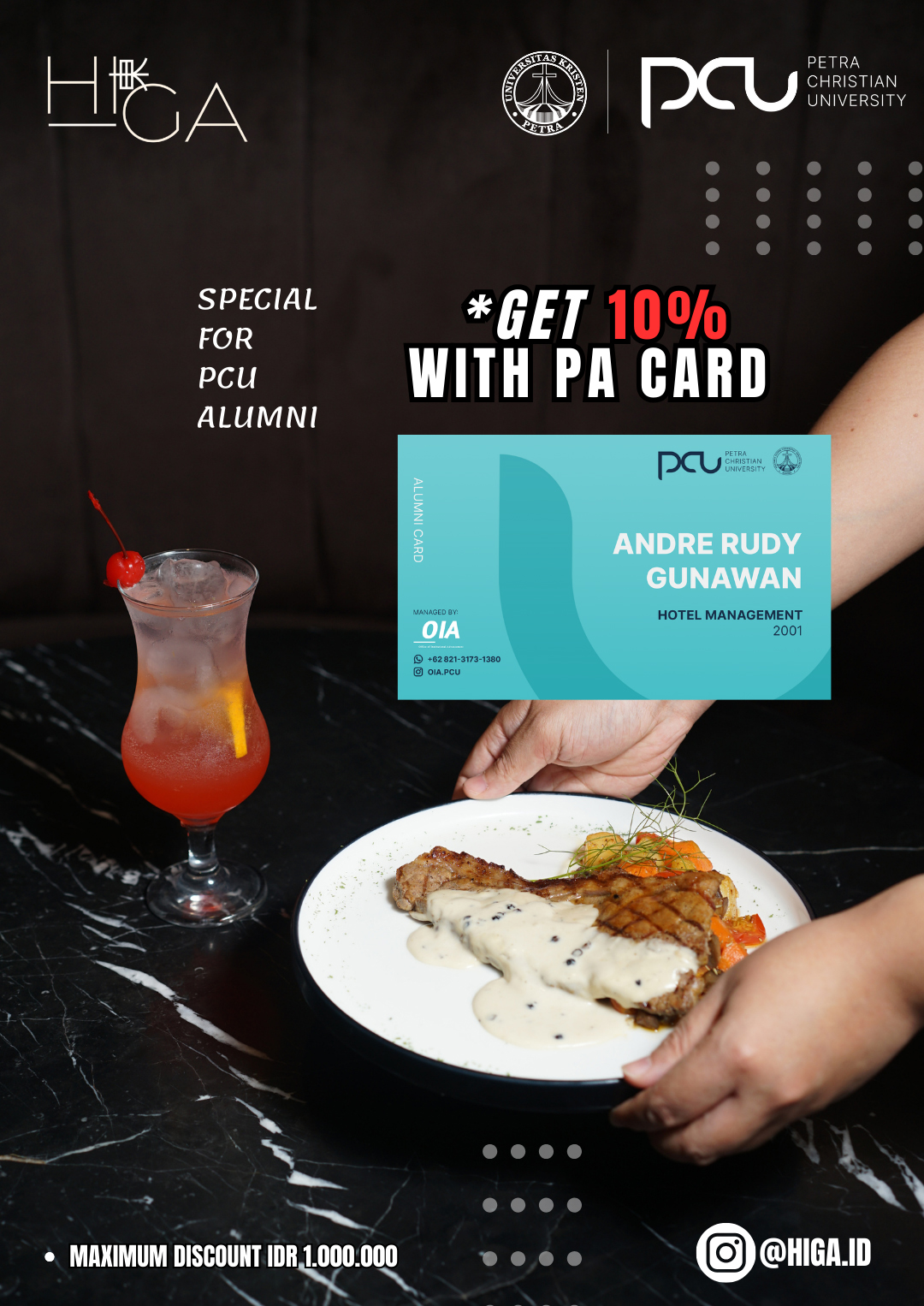 Diskon spesial bagi alumni UK Petra sebesar 10% untuk pembelian di Higa restauran. Dengan menunjukan kartu alumni UK Petra.