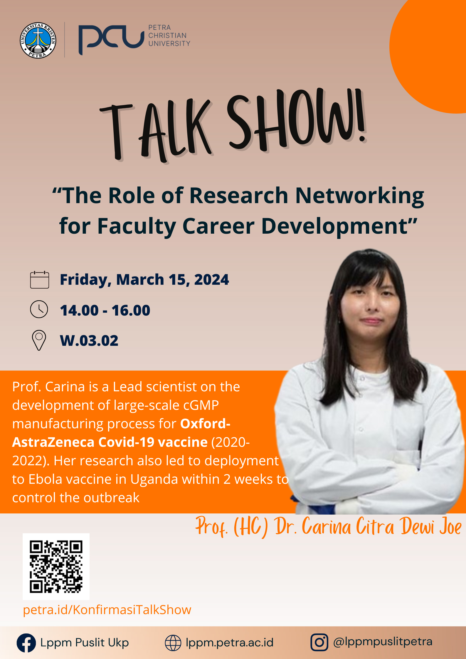 Talk Show dengan topik “The Role of Research Networking for Faculty Career Development” diselenggarakan oleh LPPM bagi para dosen dengan narasumber Prof. (HC) Dr. Carina Citra Dewi Joe yang merupakan ilmuwan utama dalam pengembangan proses manufaktur cGMP skala besar untuk vaksin Covid-19 Oxford-AstraZeneca. Acara ini diselenggarakan pada Jumat 15 Maret 2024 jam 14.00 - 16.00 WIB, di gedung W.302.