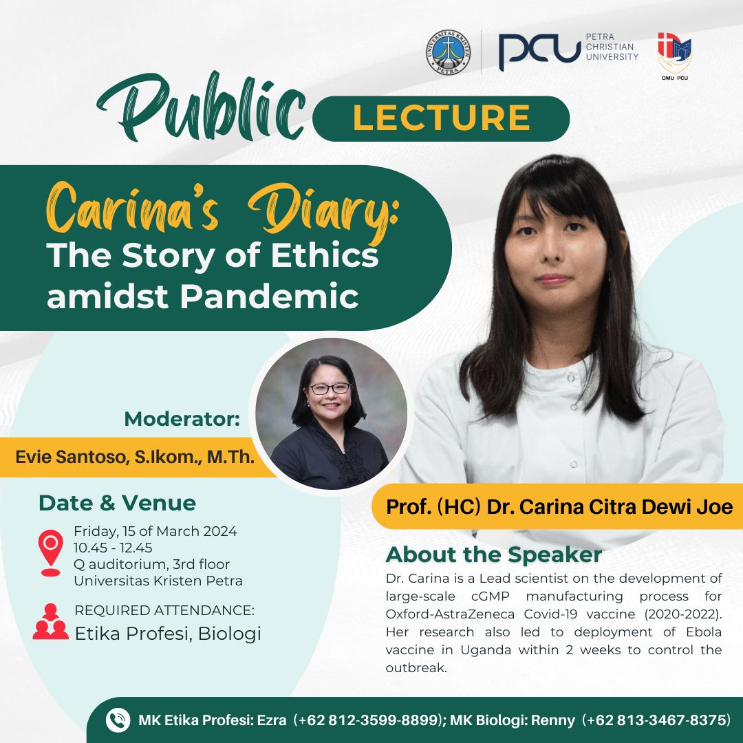 Public lecture: Carina's diary the story of ethics amidst pandemic diselenggarakan oleh Dep[artemen Mata Kuliah Umum Universitas Kristen Petra Surabaya. Dengan narasumber Prof. (HC) Dr. Carina Citra Dewi Joe yang merupakan ilmuwan utama dalam pengembangan proses manufaktur cGMP skala besar untuk vaksin Covid-19 Oxford-AstraZeneca. Acara ini diselenggarakan pada Jumat 15 Maret 2024 jam 10.45 - 162.45 WIB, di Auditorium gedung Q. lantai 3.