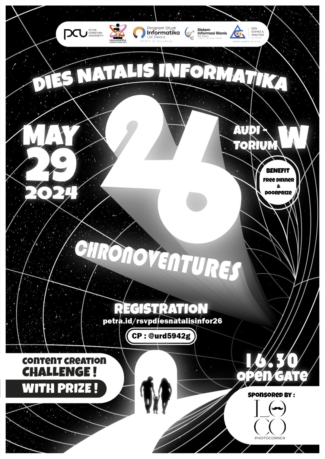 Perayaan Dies Natalis Teknik Informatika ke-26 tahun 2024 dengan tema "Chronoventures" yang bertujuan mengajak mahasiswa Informatika, Sistem Informasi Bisnis, dan Data Science & Analytics untuk mengingat pencapaian dan memotivasi untuk berani "berpetualang". Acara ini dilaksanakan pada 29 Mei 2024, bertempat di Auditorium gedung W.