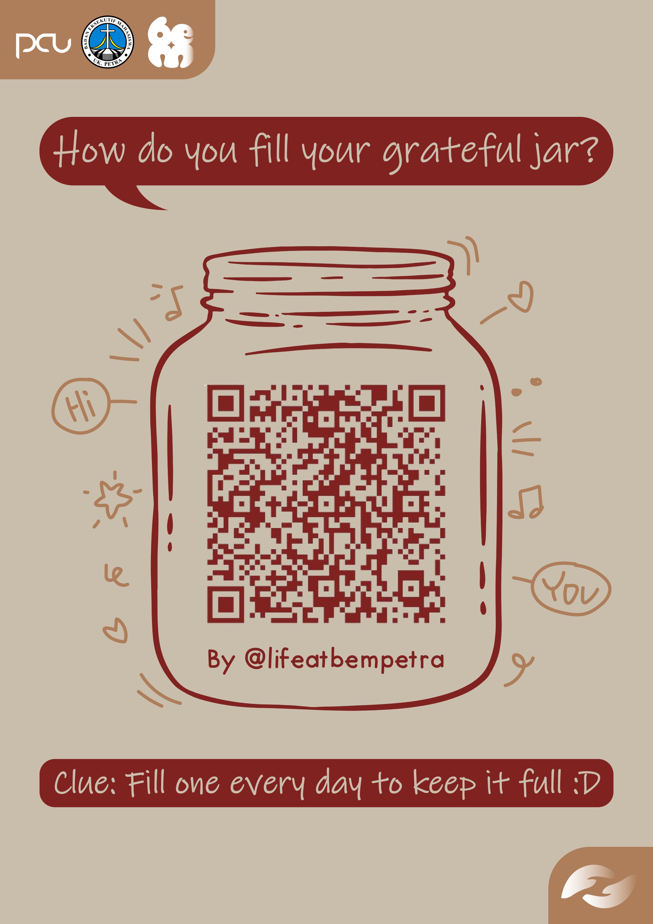 Kegiatan ini merupakan kegiatan social experiment yang dilaksanakan oleh instagram lifeatbempetra di bawah naungan departemen Human Resource Development Badan Eksekutif Mahasiswa, untuk mengingatkan mahasiswa agar dapat selalu bersyukur.