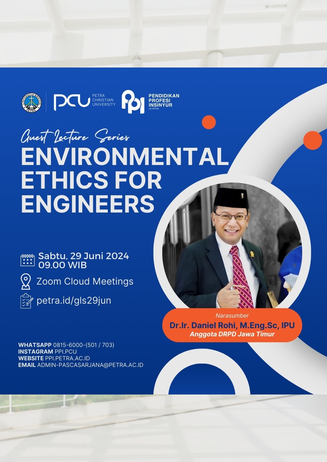 Program Pendidikan Profesi Insinyur UK Petra Surabaya mengadakan acara kuliah tamu pada Sabtu, 29 Juni 2024 Jam 09.00 WIB. Dengan melalui online Zoom Cloud Meetings, acara ini mengangkat Topik: Environmental Ethics for Engineers dengan narasumber Dr.Ir. Daniel Rohi, M.Eng.Sc, IPU, Anggota DRPD Jawa Timurđź”— Link registrasi: petra.id/gls29jun