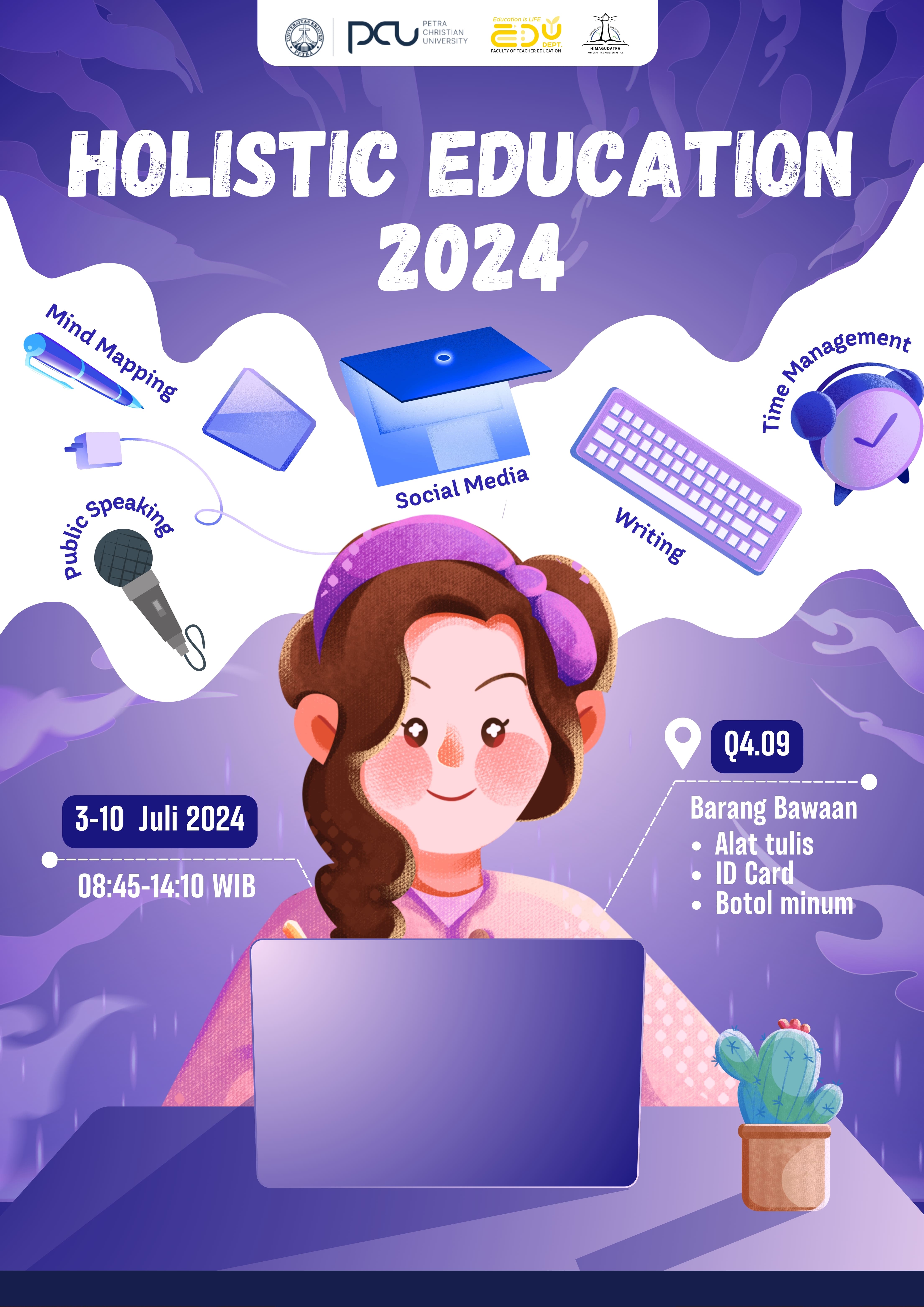 Holistic Education merupakan salah satu kegiatan pembinaan mahasiswa baru. Kegiatan ini dikhususkan bagi mahasiswa Fakultas Keguruan dan Ilmu Pendidikan. Holistic Education bertujuan mengasah soft skills mahasiswa baru sebagaiĀ bekal menjalani proses perkuliahan mendatang. Materi yang disampaikan seperti, mind mapping, manajemen waktu, penulisan ilmiah, Christian leadership, dan lain sebagainya. Acara berlangsung pada 03-10 Juli 2024. Bertempat di gedung Q.409