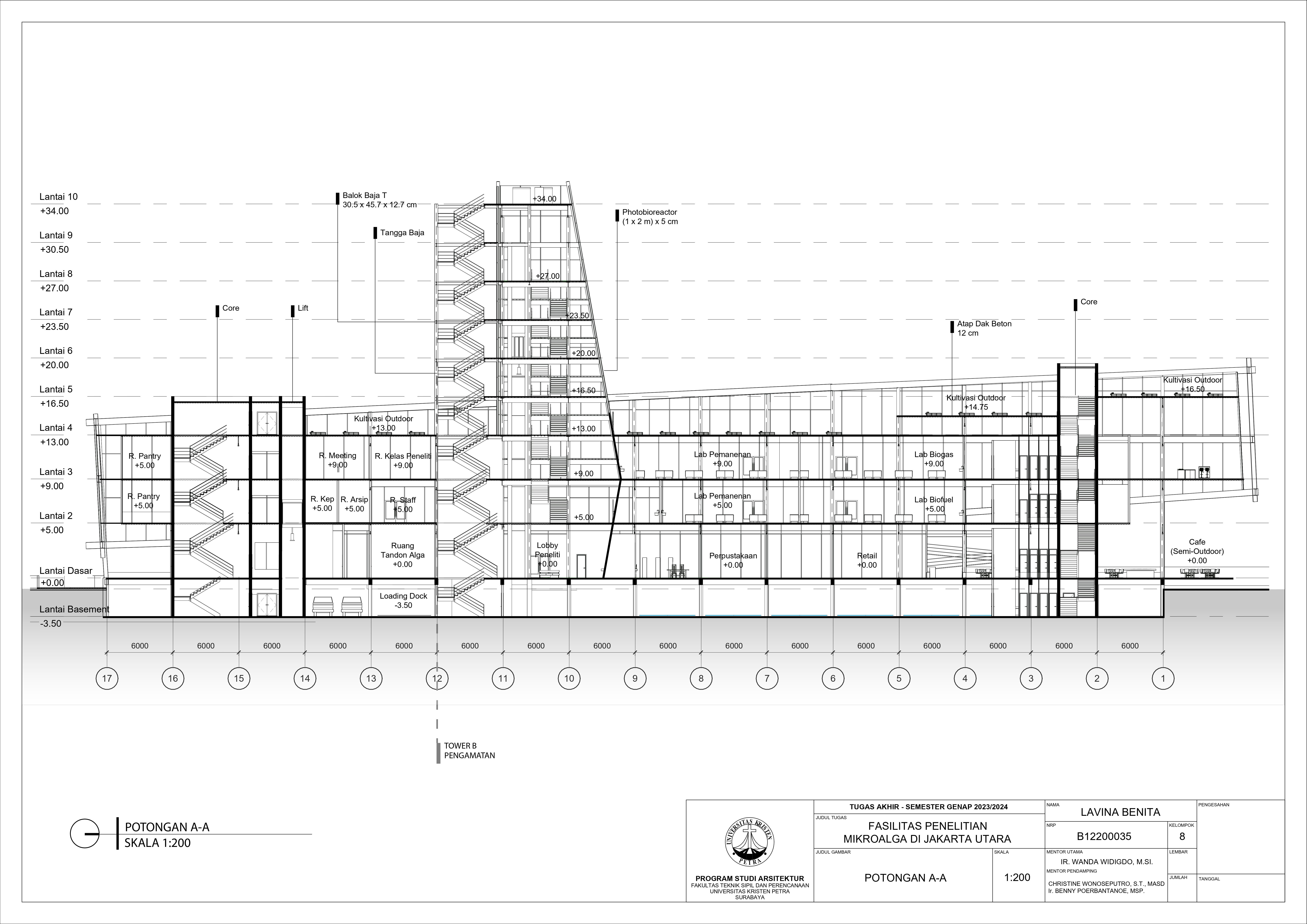 Desain Fasilitas Penelitian Mikroalga di Jakarta Utara dilatarbelakangi oleh masalah lingkungan di Jakarta. Mulai dari populasi penduduk yang terus meningkat, penggunaan energi tidak terbarukan, hingga Jakarta menempati Peringkat 4 polusi udara terburuk di dunia. Untuk mengatasi hal tersebut, pemerintah mulai mengembangkan penelitian bioteknologi dari mikroalga. Fasilitas Penelitian Mikroalga diusulkan berdiri di Jakarta Utara. Permasalahan desain utama dari fasilitas ini adalah bagaimana mewadahi sistem kultivasi mikroalga hingga menjadi energi terbarukan tanpa mengganggu lingkungan sekitar. Oleh karena itu dipilih pendekatan sistem dan pendalaman pencahayaan yang berfokus pada proses serta alur kultivasi mikroalga sebagai penyelesaian dari masalah desain. Hasil rancangan dari pendekatan dan pendalaman adalah desain yang mewadahi proses penelitian mikroalga menjadi energi terbarukan serta mengurangi pencemaran gas CO2 yang berhasil. Hasil dari desain juga meningkatkan kesadaran pengunjung akan kondisi lingkungan dan mendorong penggunaan energi terbarukan di Jakarta.