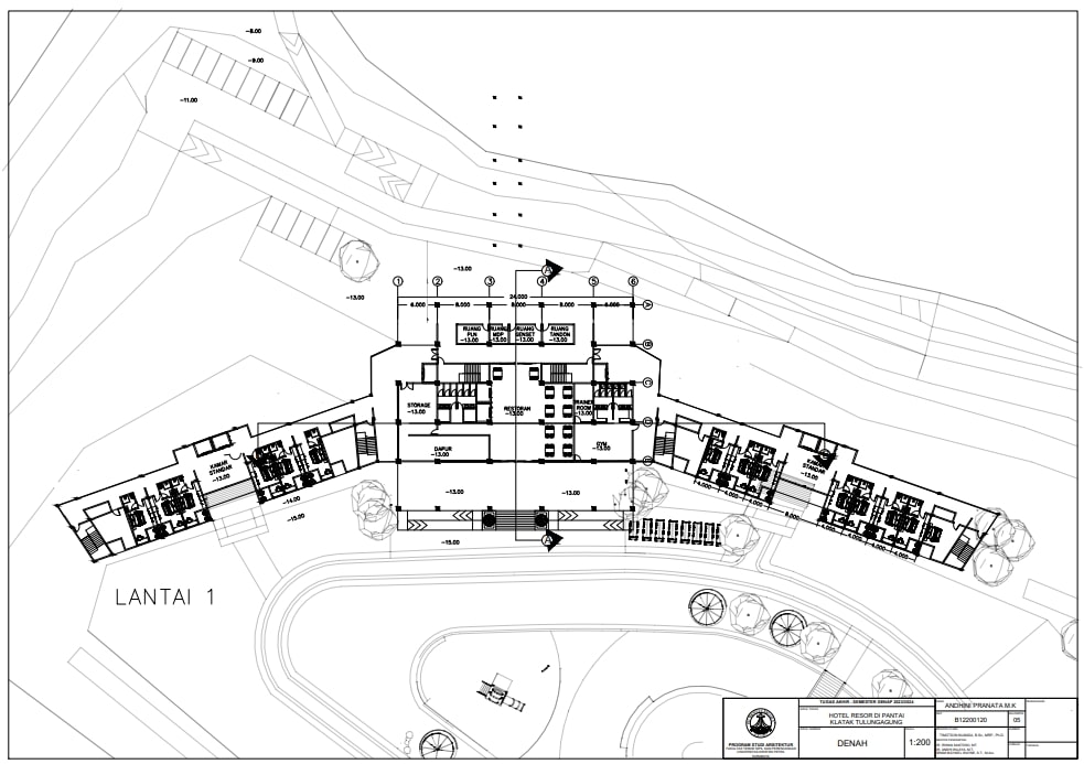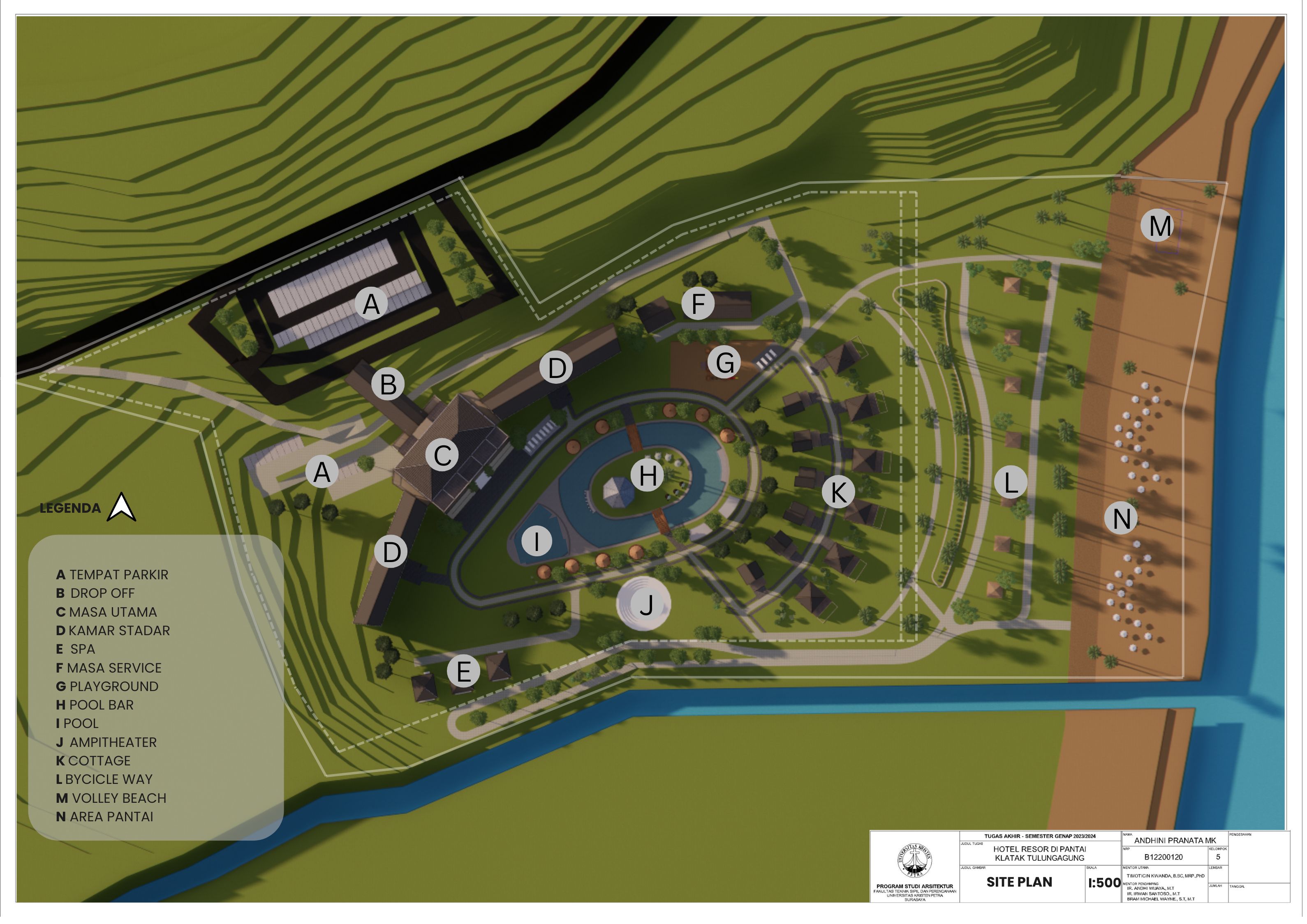 Kabupaten Tulungagung merupakan salah satu kabupaten di Jawa Timur yang berada pada wilayah laut selatan Jawa yang memiliki potensi alam pantai yang dapat dimanfaatkan sebagai pusat pariwisata. Salah satu pusat pariwisata di Kabupaten Tulungagung adalah Pantai Klatak, yang mana area tersebut dilewati oleh Jalur Lintas Selatan Pulau Jawa sehingga memudahkan akses pengunjung menuju Pantai Klatak. Namun, area tersebut belum terdapat fasilitas yang memperkenalkan Pantai Klatak kepada wisatawan yang datang, sehingga akan lebih baik jika wisatawan dapat kenal dan merasakan tinggal ditengah alam pesisir dari Pantai Klatak dari fasilitas penginapan berupa hotel resor bintang 4. Pendekatan yang diambil merupakan pendekatan sirkulasi yang mana memberikan suatu makna dan kesan terhadap ruang yang terbentuk dalam desain. Dalam sirkulasi tersebut terdapat hubungan antar ruang yang optimal serta membentuk suatu vista dari pengalaman ruang yang dirasakan. Perencanaan fasilitas penginapan bertujuan untuk mengakomodasi para wisatawan yang ingin kenal serta menikmati keindahan alam pesisir di Pantai Klatak. Dalam desain, fasilitas yang ditawarkan berupa standar hotel resor bintang 4 yang mana terdapat fasilitas penginapan resor, kamar standar, spa, kolam renang, restoran, serta area lansekap yang dikelilingi oleh alam pesisir. Semua area fasilitas yang di desain, memanfaatkan secara optimal dari alam pedisir dari Pantai Klatak sehingga membentuk sebuah karakteristik ruang dengan menciptakan suasana yang diinginkan.