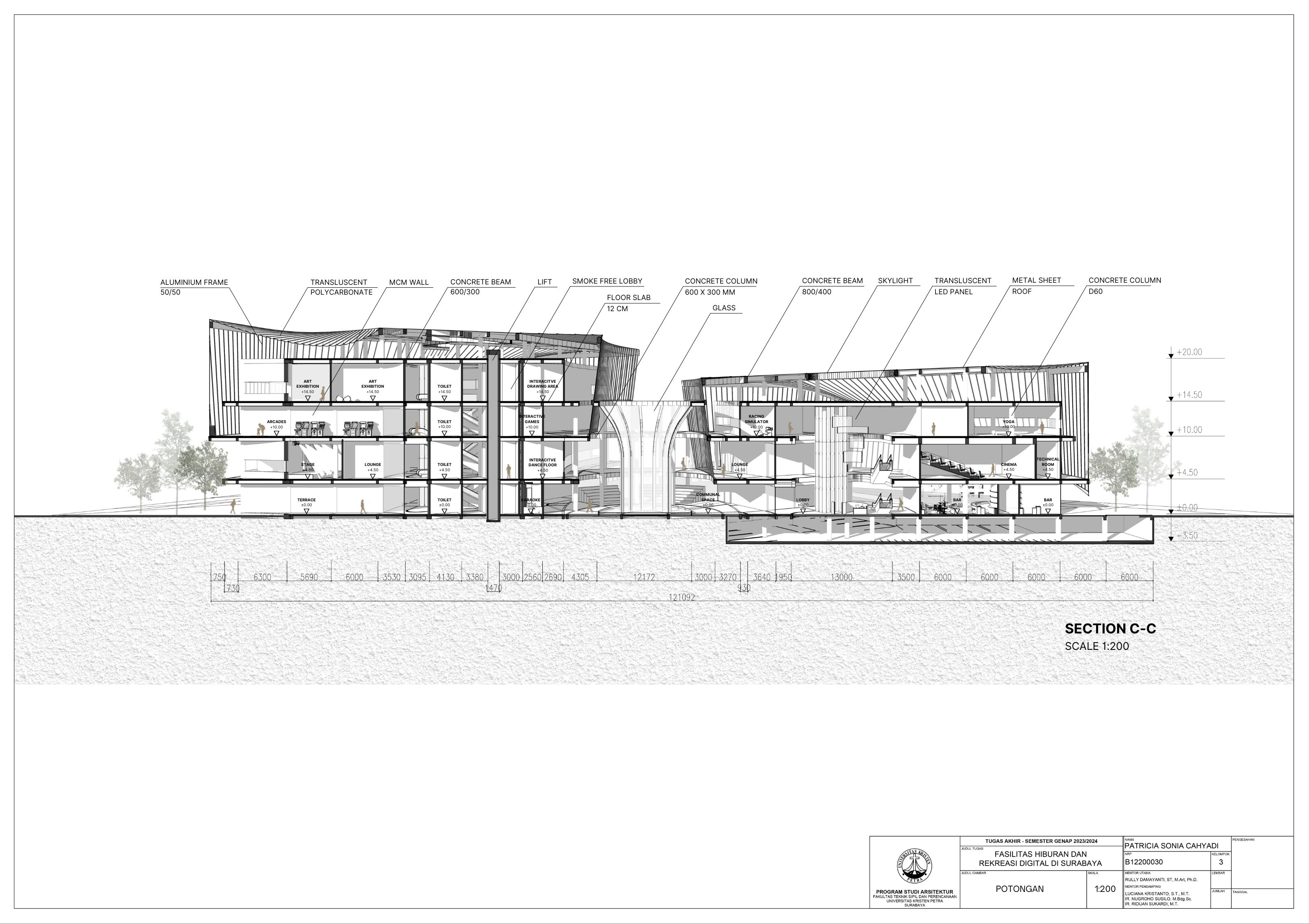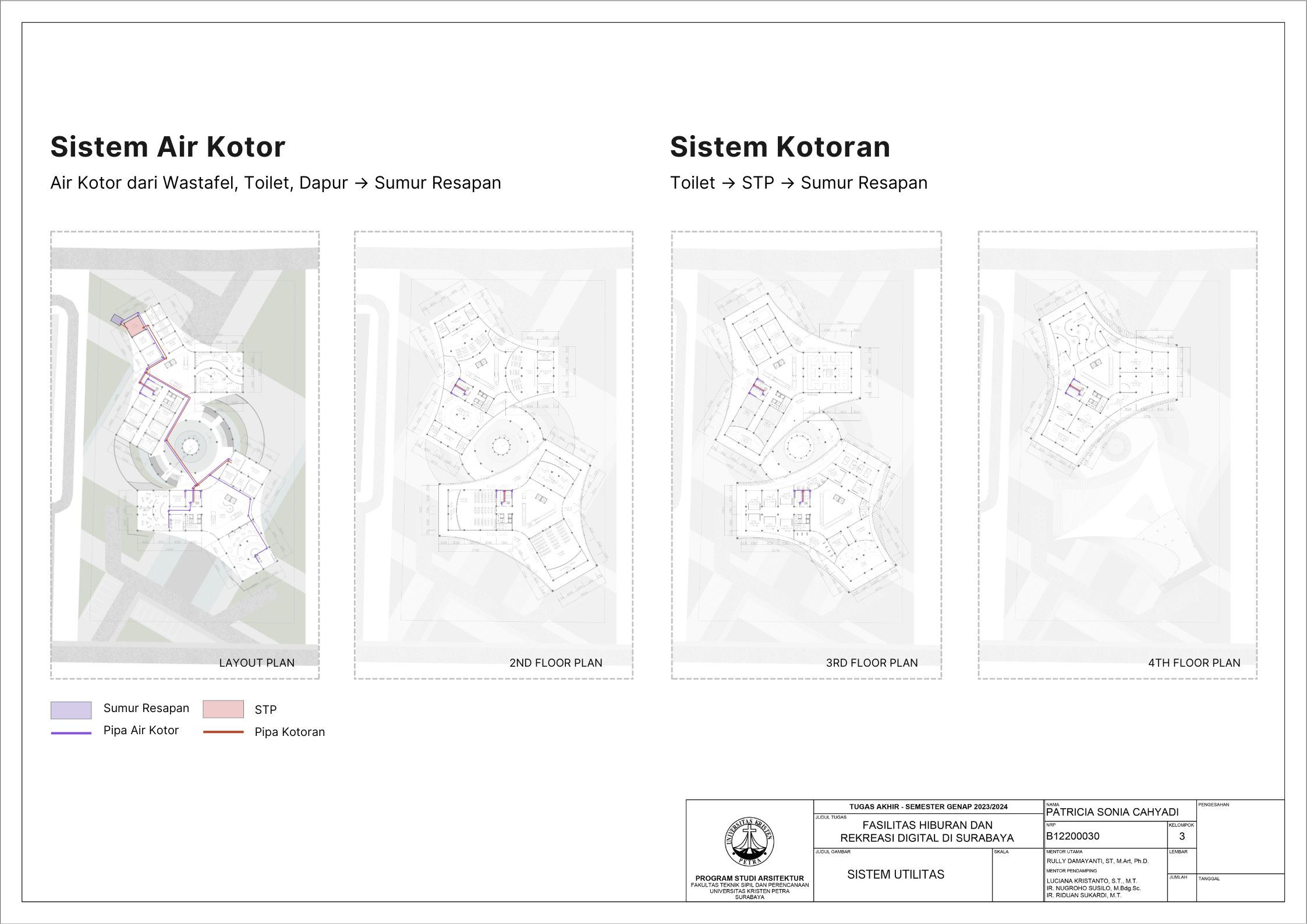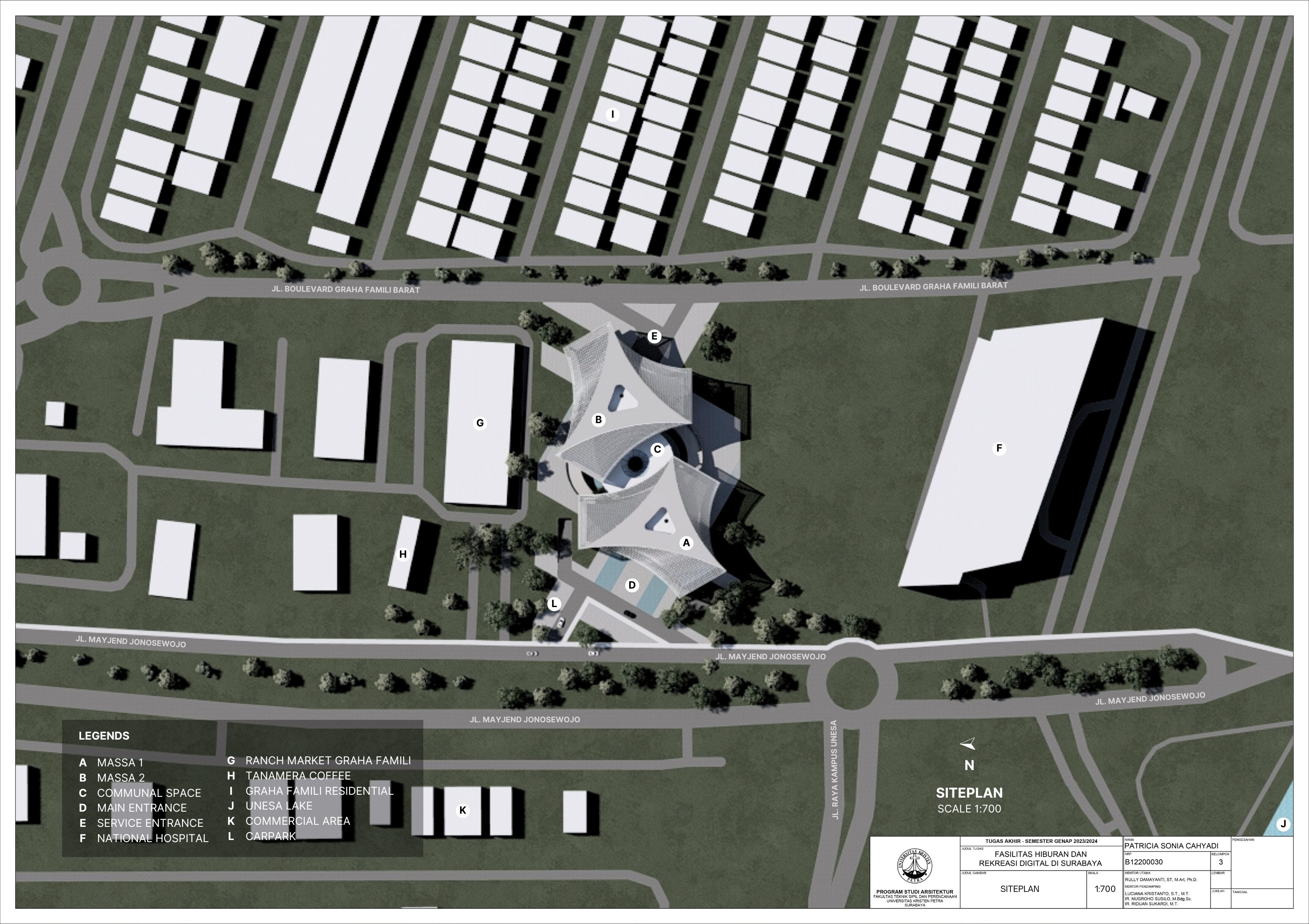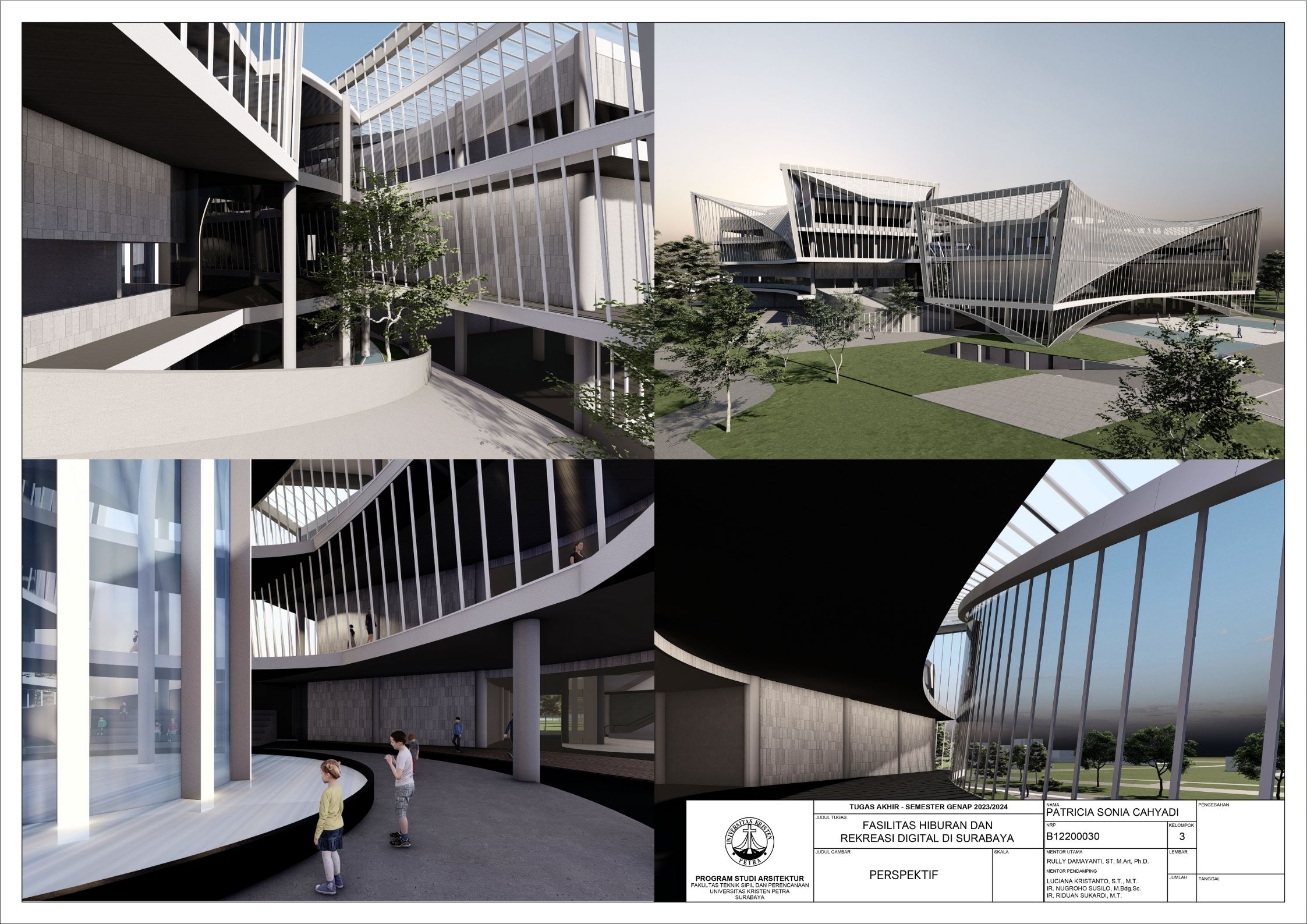 Surabaya merupakan kota dengan pertumbuhan penduduk yang tinggi namun menghadapi tingkat stres yang signifikan; sehingga membutuhkan tempat hiburan dan rekreasi positif dan aktif. Dalam menghadapi tuntutan ini, teknologi digital memainkan peran penting seiring dengan perkembangan zaman yang terus berlangsung. Tujuan dari laporan ini adalah mengusulkan desain arsitektur untuk fasilitas hiburan dan rekreasi digital di Surabaya dengan pendekatan multisensori. Pendekatan multisensori adalah pendekatan arsitektur berbasis pengalaman ruang yang memperhatikan keharmonisan berbagai indra (sensori). Metode perancangan yang dipakai melalui studi fungsional dan arsitektur pada bangunan preseden, dan sintesa hasil analisis tapak, konsep desain, dan program ruang. Konsep desain bangunan ini adalah sensory scape, yang bertujuan untuk menciptakan pengalaman multisensori yang mendalam bagi para pengunjung. Desain bangunan memberikan kesempatan pada setiap pengunjung untuk menikmati momen pemulihan dan kesenangan yang akan menyegarkan pikiran dan tubuh. Fasilitas terbagi menjadi tujuh zona utama yaitu makanan, film, olahraga, musik, pertunjukan, permaian, dan seni. Setiap zona dirancang dengan memanfaatkan teknologi digital secara optimal, sehingga dapat memberikan pengalaman interaktif dan menarik bagi masyarakat. Hasil rancangan yang menekankan pada pengolahan ruang publik dengan memanfaatkan teknologi digital ini diharapkan dapat memberikan usulan desain untuk menurunkan tingkat stres para pelajar dan pekerja di kota Surabaya.