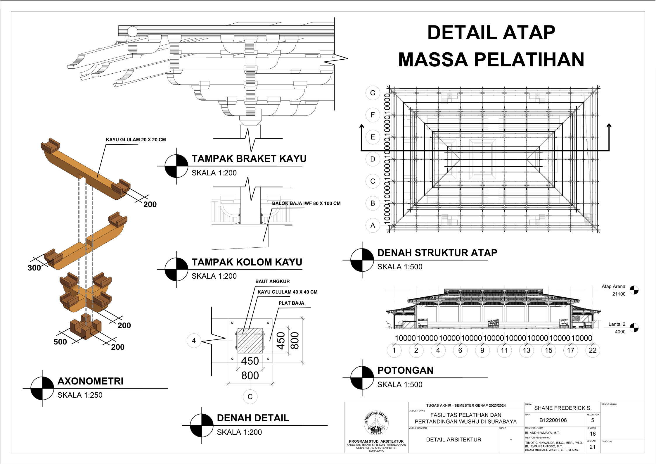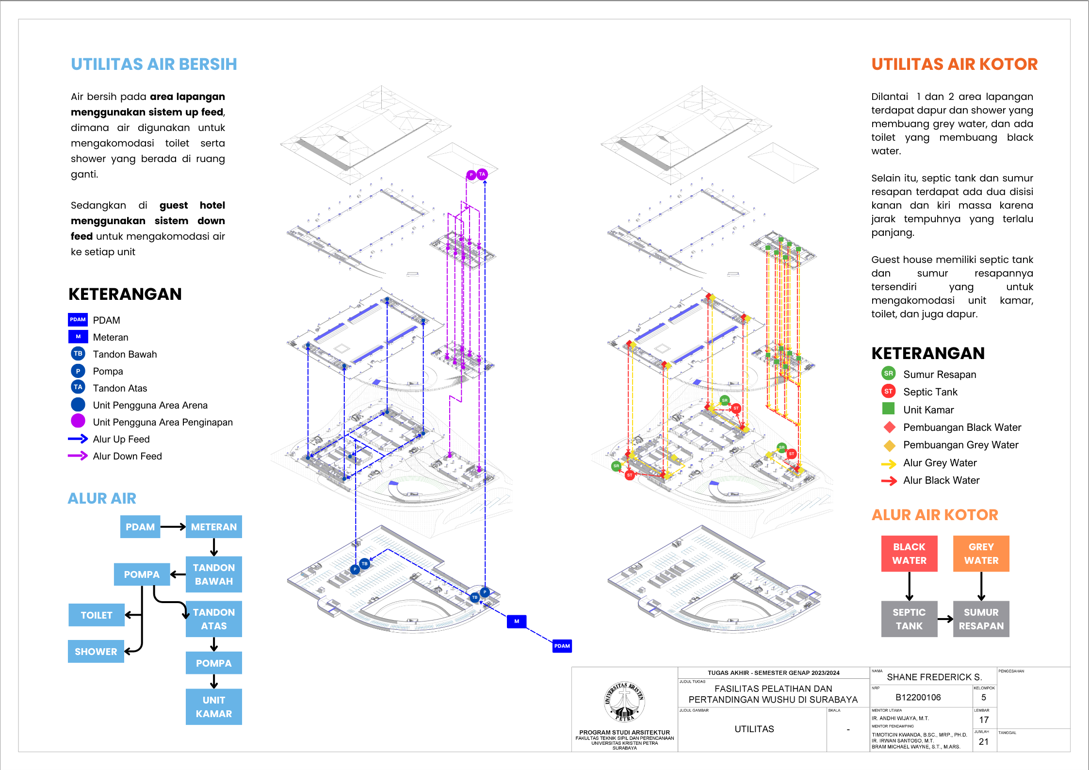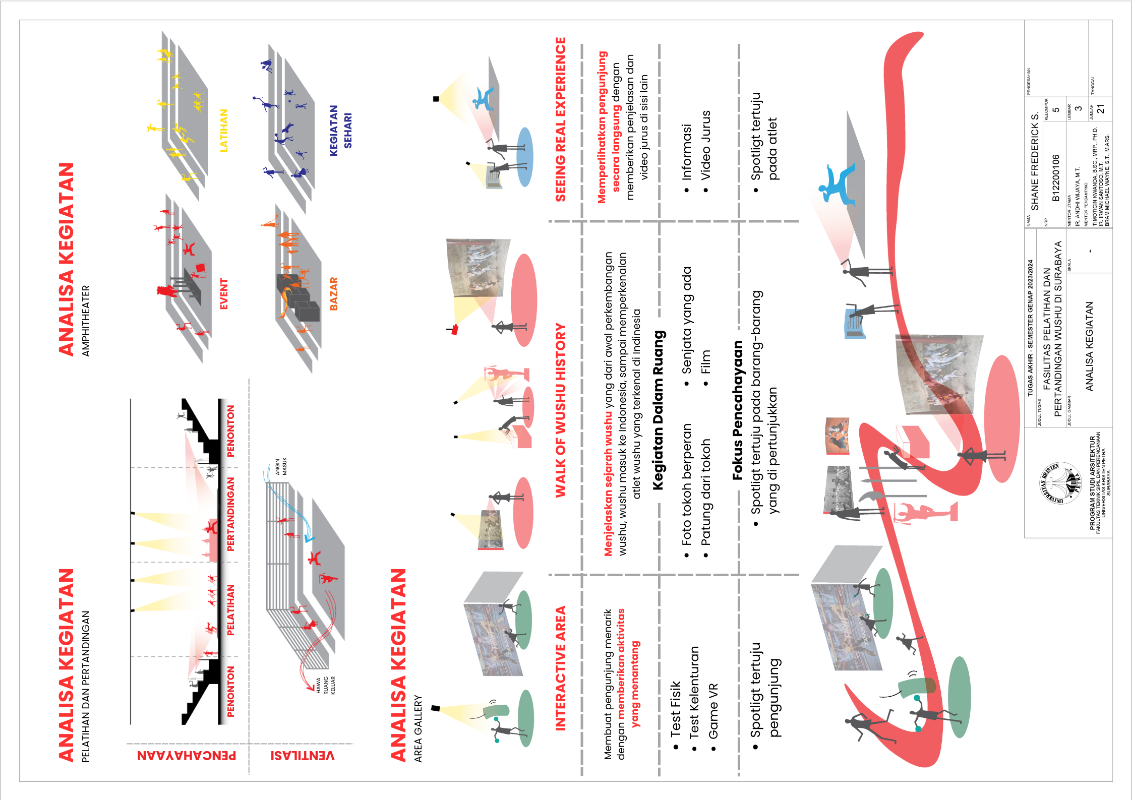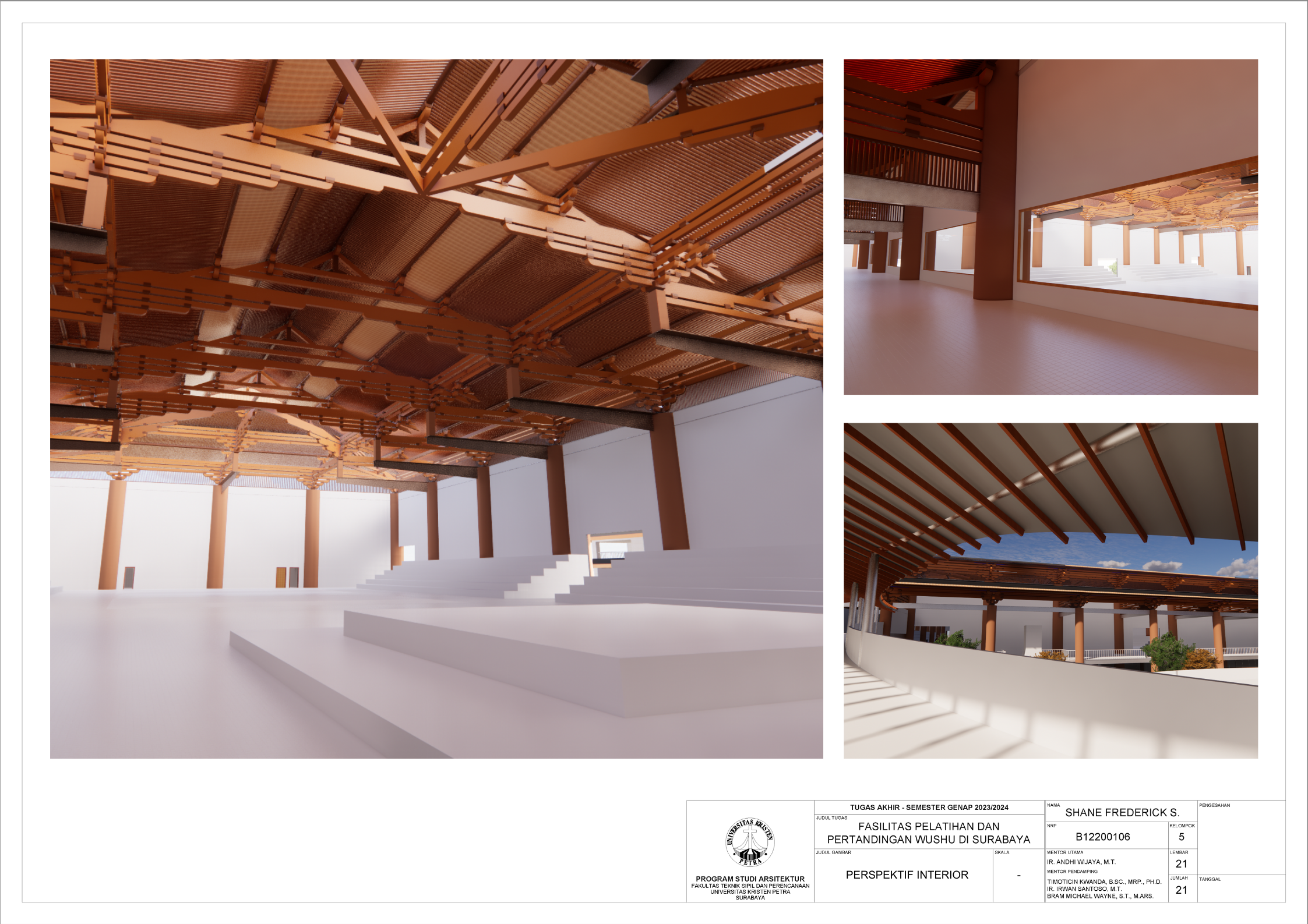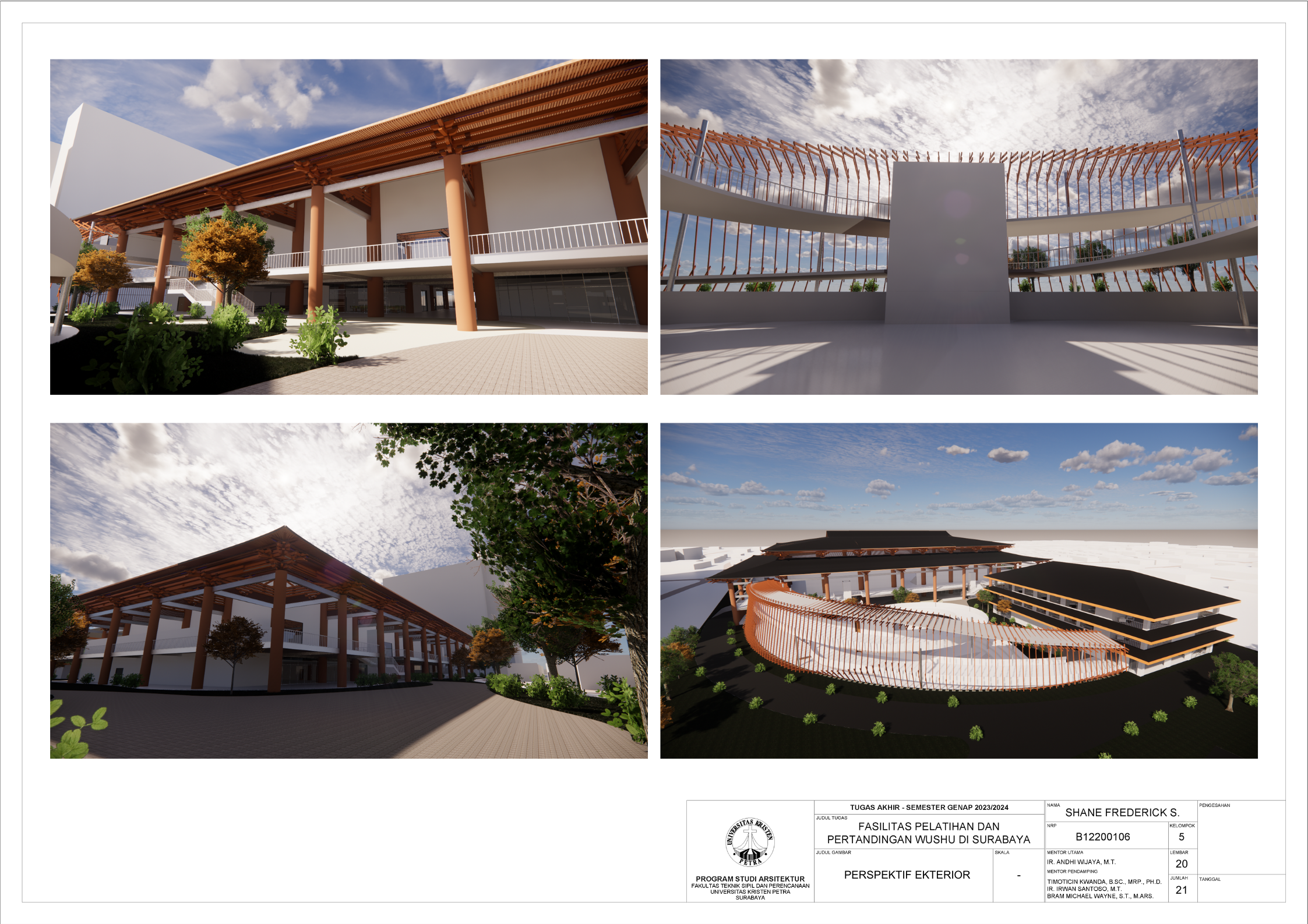Wushu adalah sebuah seni bela diri berasal dari China, yang telah menjelma menjadi daya tarik khusus di Indonesia. Di kota Surabaya menjadi pusat utama minat wushu di Indonesia, terutama untuk kalangan generasi muda. Lebih dari sekadar bela diri atau pencapaian, wushu juga sebagai olahraga rekreasi dan kebugaran yang tak hanya meningkatkan kesehatan fisik tetapi juga membawa nilai-nilai disiplin, kontrol diri, dan pengembangan aspek mental. Meskipun popularitas wushu terus berkembang namun, masih terdapat sejumlah tantangan, seperti kurangnya infrastruktur pelatihan yang memadai, kesadaran masyarakat yang perlu ditingkatkan, kurangnya koordinasi, dan kurangnya perhatian terhadap keselamatan atlet. Perancangan fasilitas pelatihan dan pertandingan wushu bertujuan memenuhi kebutuhan atlet untuk dapat menunjang perfoma mereka menjadi lebih baik. Selain itu, fasilitas juga dirancang untuk memberikan pendidikan dan pengalaman pengunjung, terutama untuk menarik minat generasi muda. Pendekatan yang digunakan adalah pendekatan perilaku. Pendekatan tersebut diterapkan dengan memahami pola perilaku atlet saat berlatih, serta perilaku pengunjung pada saat ingin mengetahui tentang wushu. Dengan memahami pola perilaku atlet dan pengunjung, fasilitas bertujuan untuk menciptakan ruang yang memiliki alur yang nyaman dan baik untuk kedua pihak.
