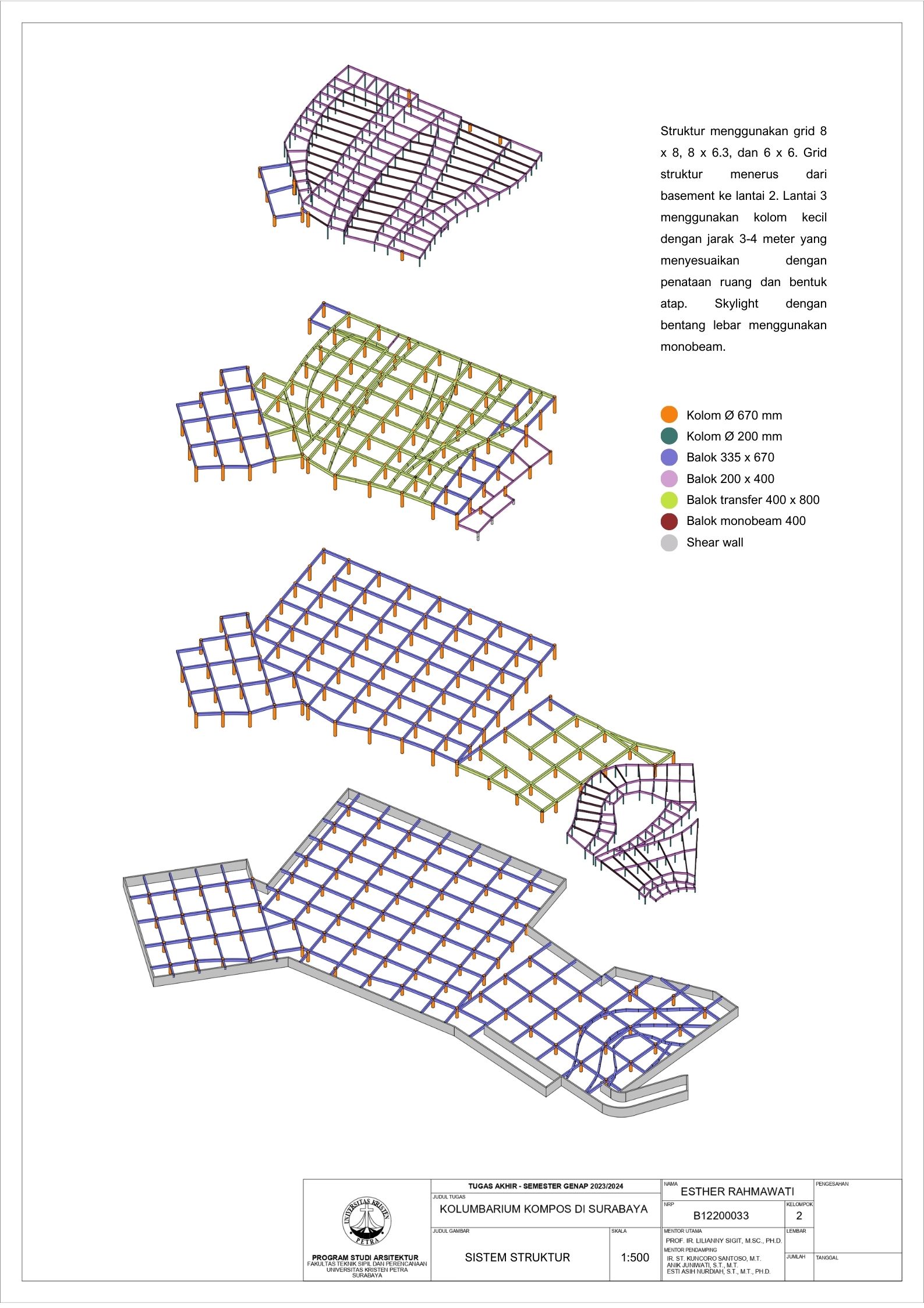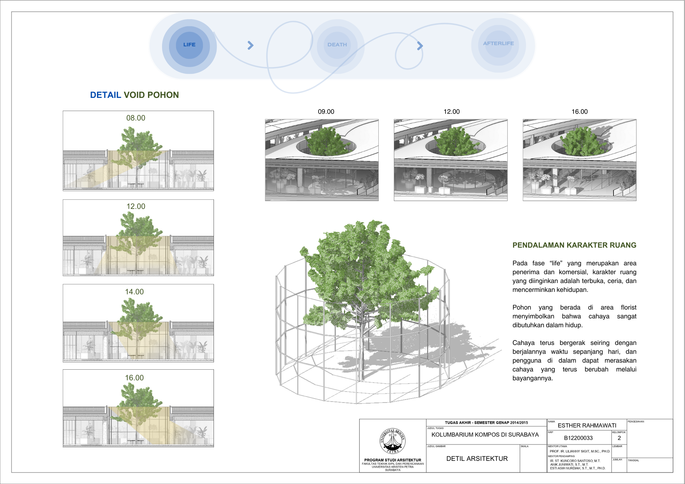 Kebutuhan akan pemakaman adalah hal yang mutlak, tetapi seiring berjalannya waktu, jumlah lahan untuk pemakaman di Surabaya semakin minim. Hal ini mengarah kepada pemakaman vertikal, tetapi mausoleum memiliki resiko kebocoran cairan tubuh yang tinggi. Alternatif kremasi sering menjadi pilihan, tetapi menghasilkan jutaan emisi karbon setiap tahunnya. Pengomposan manusia merupakan alternatif baru yang lebih ramah lingkungan dibandingkan dengan kremasi atau penguburan di tanah, membantu menurunkan output karbon sebesar 1,2 juta metrik ton dari proses tradisional. Perancangan kolumbarium kompos ditujukan untuk memfasilitasi kebutuhan pemakaman vertikal yang aman sekaligus ramah lingkungan. Kolumbarium kompos ini memiliki 2 fungsi utama, yaitu fasilitas pengomposan manusia dan fasilitas peringatan. Fasilitas peringatan yang berupa tanah kompos dan tanaman diharapkan dapat membantu mengurangi polusi kota Surabaya sekaligus mengurangi stigma negatif mengenai pemakaman. Perasaan baik ketika pengguna melakukan ziarah adalah aspek yang penting dalam desain bangunan ini. Sains bangunan seperti pencahayaan, suhu, dan kelembaban juga perlu diperhatikan untuk memastikan tanaman dapat tumbuh dengan sehat. Dari aspek-aspek tersebut, digunakan pendekatan sains dan pendekatan simbolik secara intangible dengan dimana kematian adalah awal, bukanlah akhir.