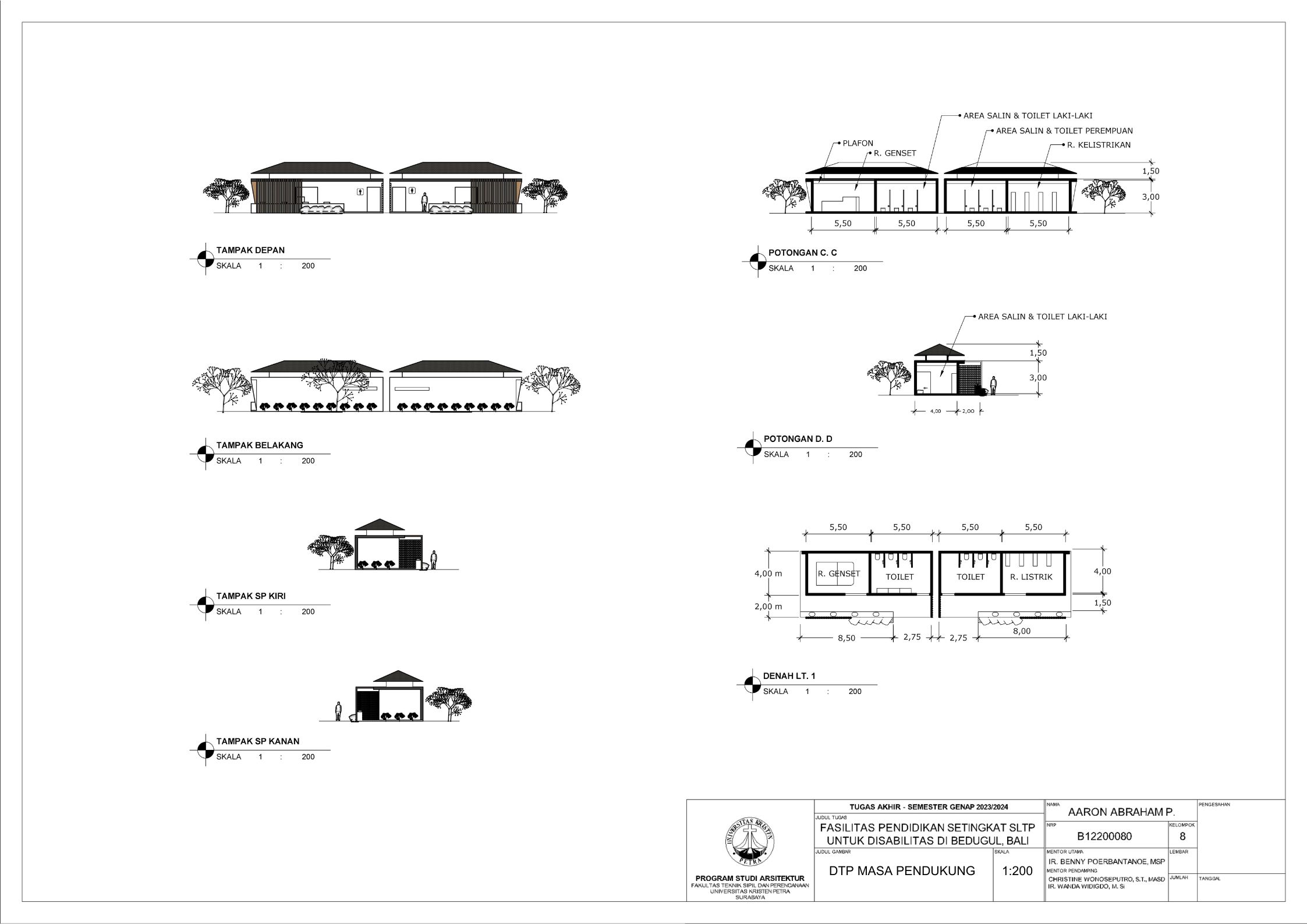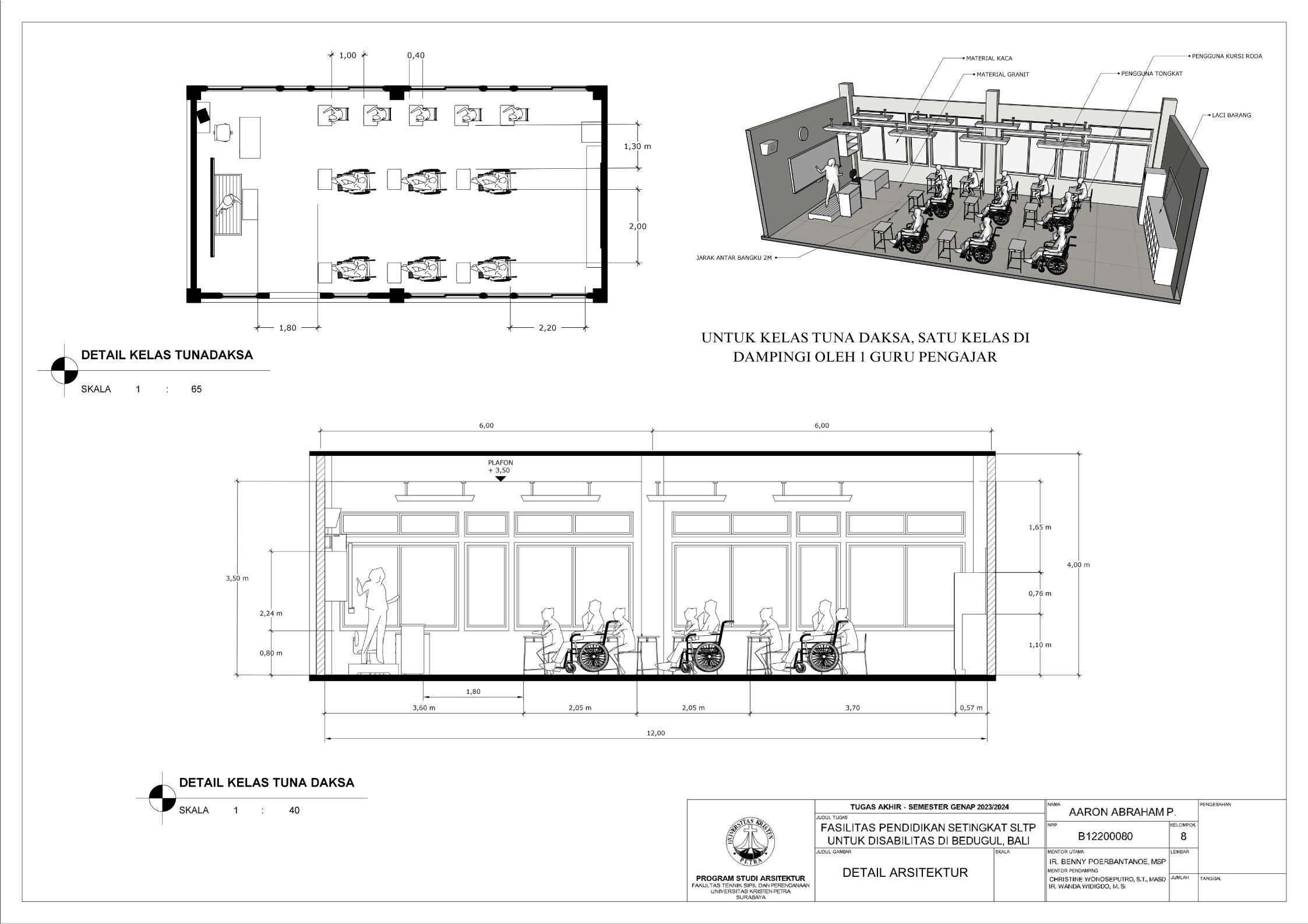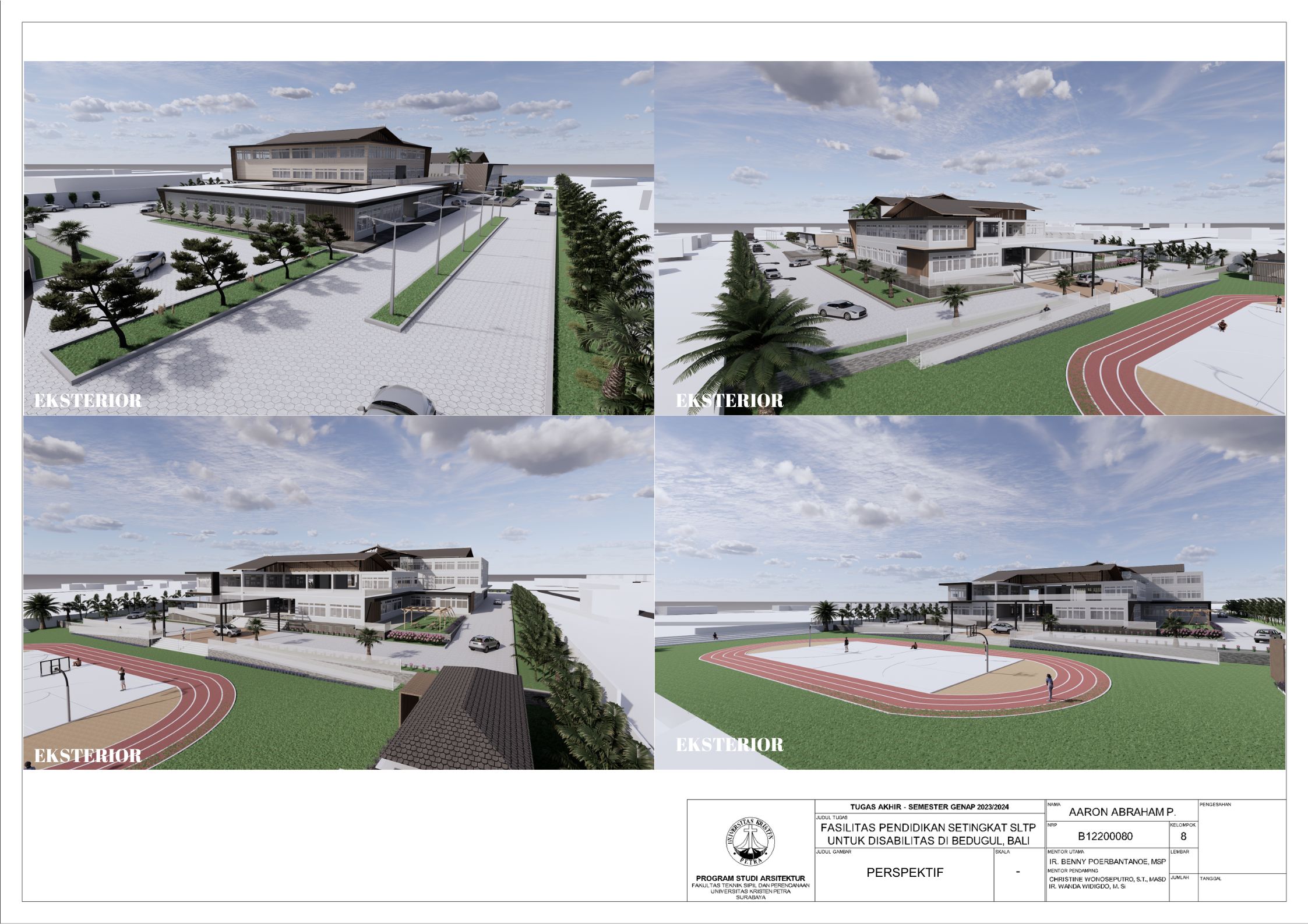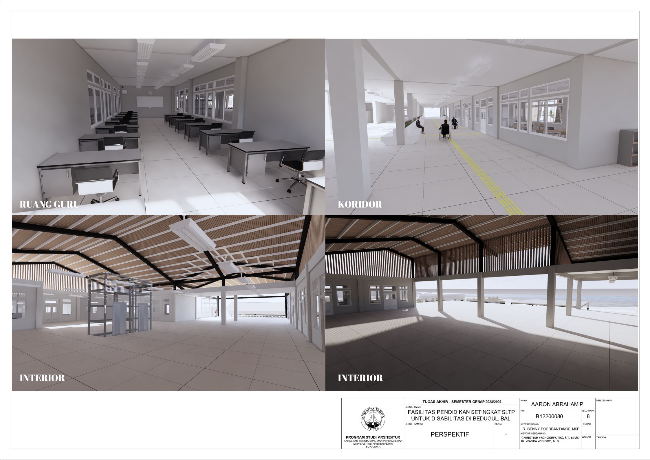 Sekolah disabilitas adalah sekolah yang menyediakan sarana pendidikan bagi penyandang disabilitas agar penyandang disabilitas memiliki kesempatan pendidikan yang sama dengan non-disabilitas. Sekolah disabilitas yang dirancang adalah sekolah tingkat SMP atau SLTP, yang memiliki 3 tingkat kelas, yaitu kelas 1, kelas 2, dan kelas 3. Setiap kelas terbagi menjadi 3 ketunaan yang didalami yaitu tuna daksa, tuna rungu, dan tuna netra, dengan kebutuhan yang berbeda. Tuna daksa yang memerlukan desain yang dapat diakses setiap ruangannya dengan desain khusus seperti ramp yang sesuai dengan standar, tuna netra dengan guide path yang memadai, dan tuna rungu dengan desain kelas yang kedap suara agar siswa dapat berkonsentrasi dengan maksimal. Dengan adanya kebutuhan khusus masing-masing ketunaan, maka harus memperdalami perilaku siswa. Maka dari itu pendekatan yang digunakan adalah metode pendekatan perilaku disabilitas agar dapat menciptakan sebuah sekolah yang dapat menyesuaikan perilaku dan sesuai dengan kebutuhan siswa disabilitas. Sekolah yang dirancang sesuai dengan perilaku siswa dapat melatih kemandirian, pemberdayaan, dan integrasi siswa dalam masyarakat.