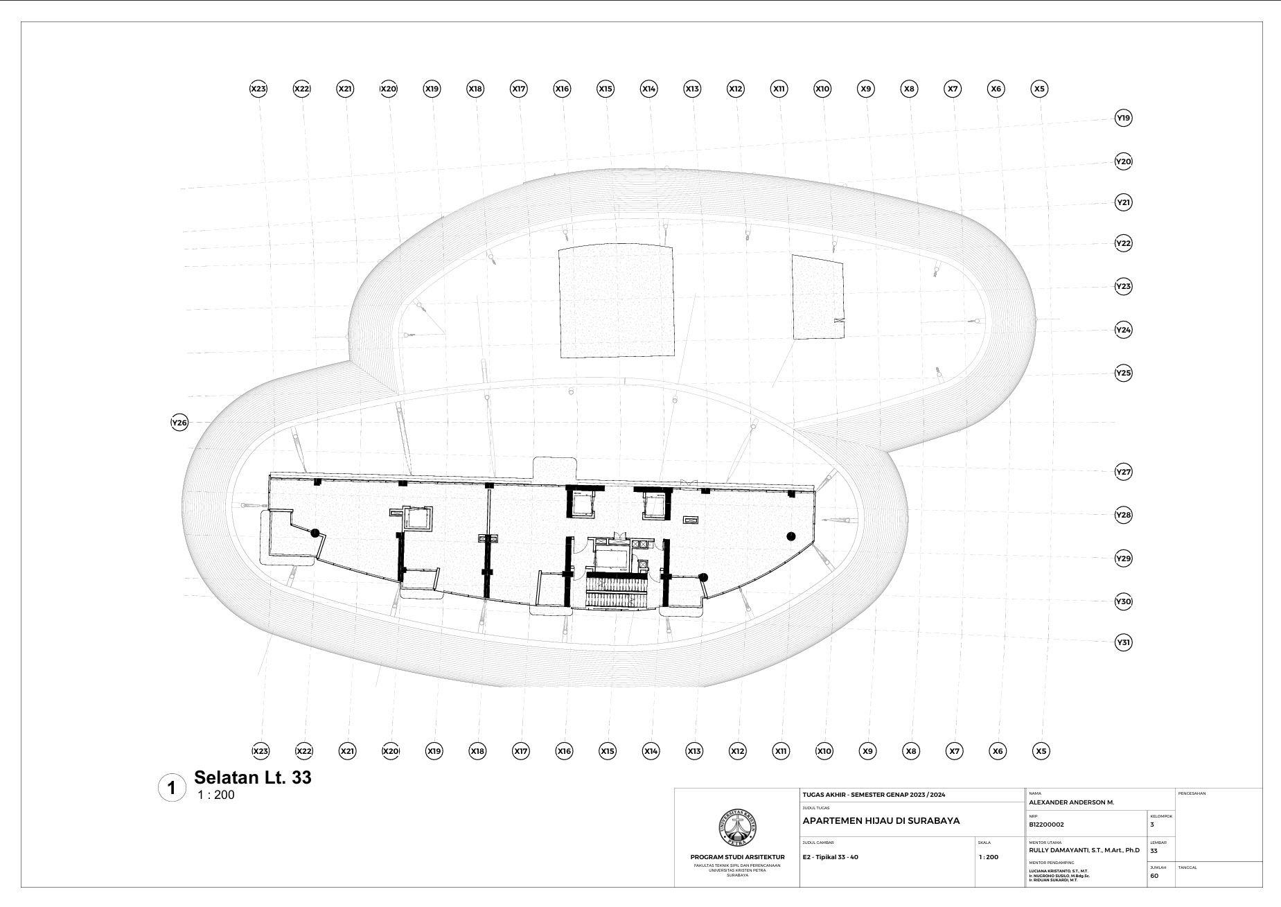 Kota Surabaya merupakan pusat perekonomian regional yang mengalami pertumbuhan populasi dan ekonomi setiap tahunnya. Meskipun telah bertumbuh meluas, Surabaya Pusat tetap merupakan salah satu pusat kegiatan terpenting di Kota Surabaya; hal ini ditunjukkan oleh kehadiran pengembangan-pengembangan baru di Surabaya Pusat. Namun, Surabaya Pusat sedang menghadapi tantangan tersembunyi, yakni kenaikan suhu area urban yang disebabkan oleh konstruksi serta minimnya ruang hijau terbuka. Fenomena yang diberi nama efek Urban Heat Island (UHI) ini semakin diperparah dengan pertumbuhan kota yang menimbulkan banyak pengembangan baru; menciptakan sebuah lingkaran umpan balik positif yang semakin memperparah efek UHI di Surabaya Pusat. Pengembangan-pengembangan baru sebaiknya mampu merespons pertumbuhan kota, namun dalam waktu yang sama, sekaligus merespons UHI. Proyek ini menawarkan sebuah pengembangan mixed-use berbasis hunian yang mengintegrasikan alam (cahaya, udara, vista, air, vegetasi) melalui pendekatan Nature-based Placemaking (NBP). Analisis pergerakan udara (CFD) mendasari orientasi dan bentuk bangunan untuk memperoleh penghawaan yang optimal. Dua buah tower hunian dengan segala fasilitas penunjangnya dihubungkan dengan podium komersil. Celah yang menerus secara diagonal pada setiap tower mempermudah laluan vista, cahaya dan udara; dan taman-taman gantung menyediakan ruang-ruang bagi penghijauan vertikal dan aktivitas luar ruangan di seluruh bangunan. Desain ini menciptakan sebuah kompleks baru yang merespons pertumbuhan kota sekaligus permasalahan iklim.