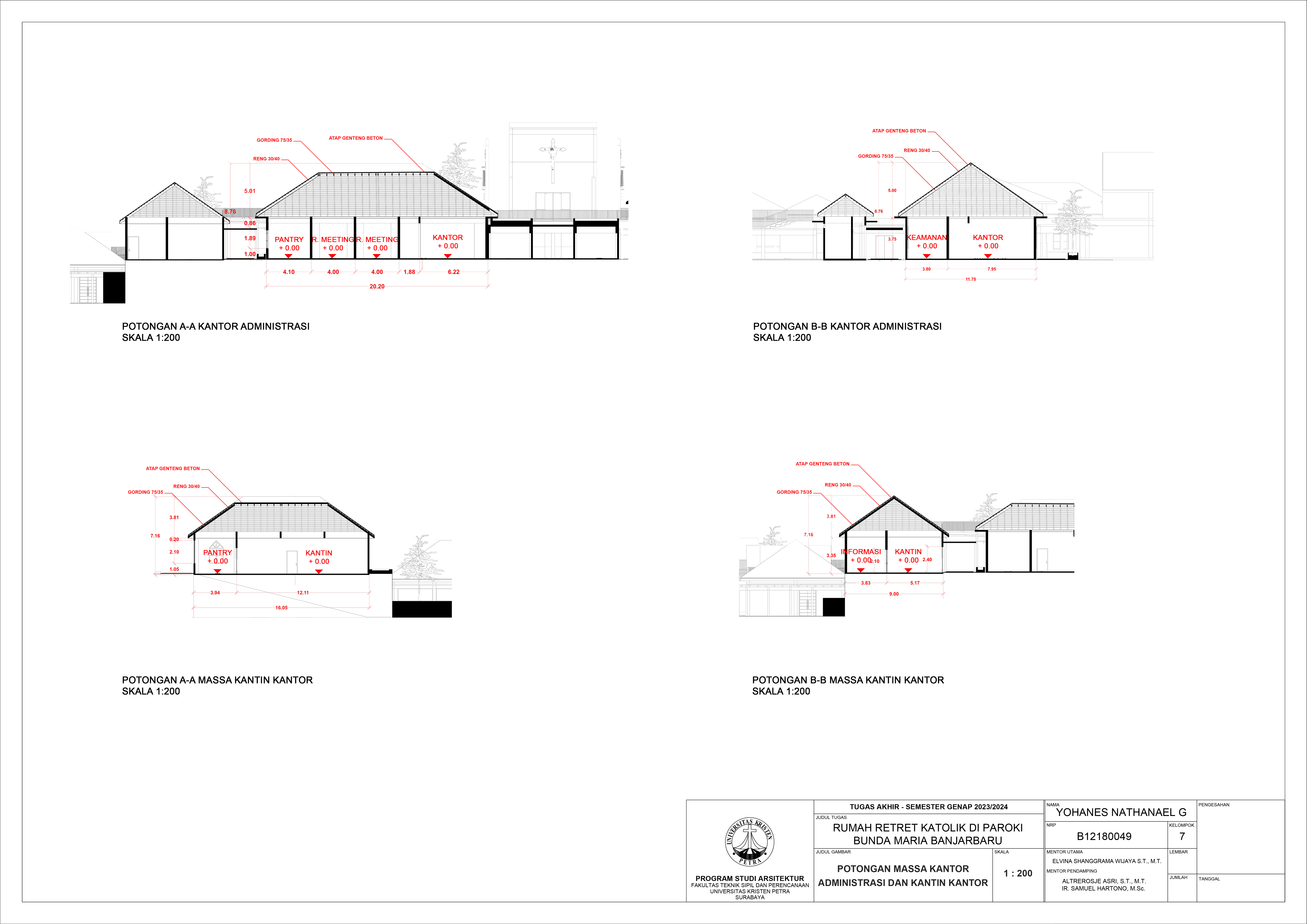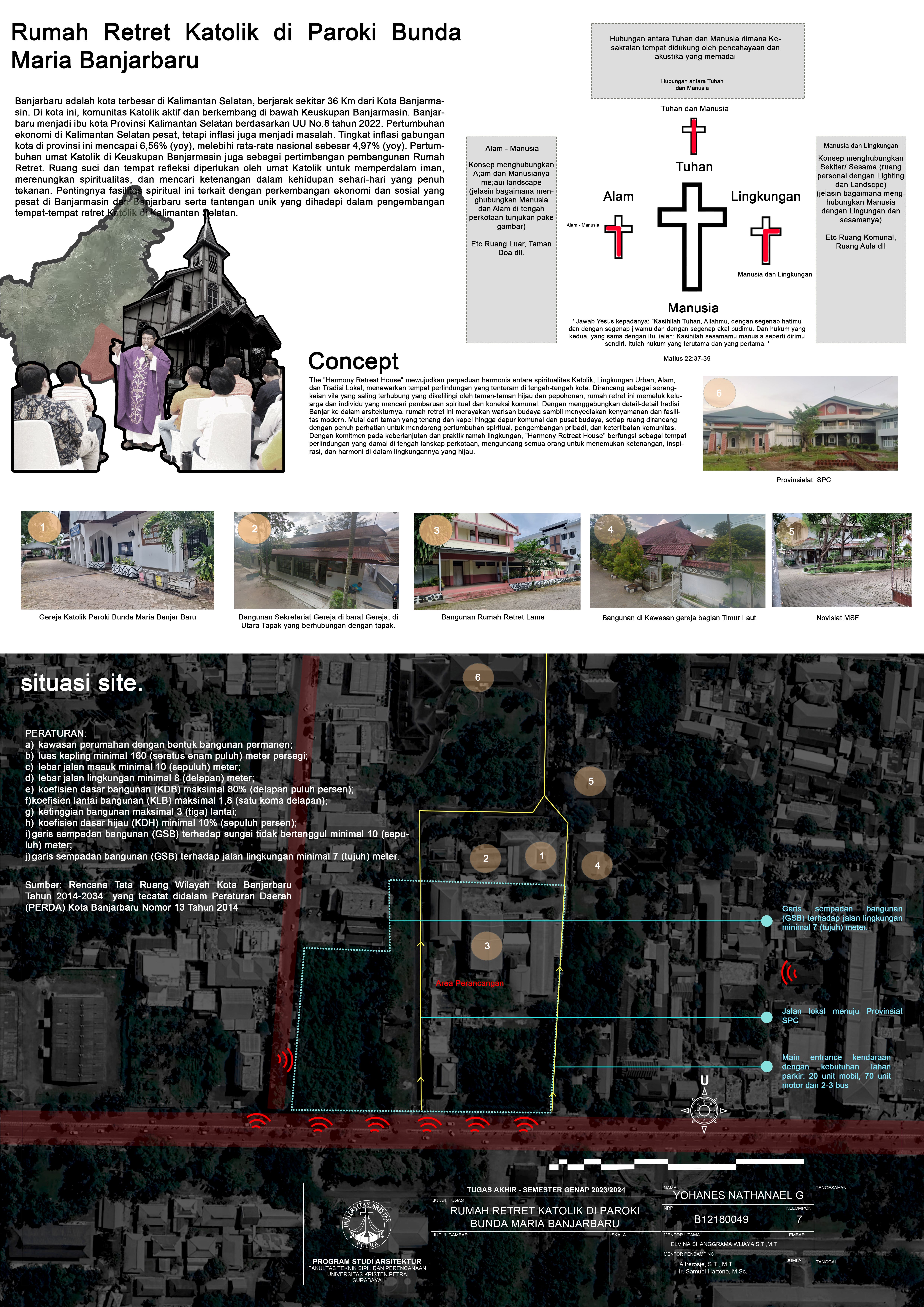 dan juga dihadapkan pada tantangan Ekonomi yang meningkat. Situasi ini menyoroti perlunya ruang-ruang suciuntuk memperdalam iman dan spiritualitas di tengah kesibukan dan tekanan kehidupan modern. Rumah RetretKatolik di Paroki Bunda Maria Banjarbaru adalah sebuah respons kebutuhan mendalam komunitas Katolik diKalimantan Selatan untuk memiliki tempat refleksi spiritual yang tenang dan mendalam. Perancangan RumahRetret ini menawarkan solusi dengan menyediakan fasilitas komprehensif termasuk kapel, ruang doa, aula, areahunian, ruang makan, serta fasilitas pendukung lainnya seperti toilet umum dan area parkir. Desainnyamengutamakan kesakralan dan kenyamanan personal dengan pendekatan holistik melalui penggunaan pencahayaan alami, lanskap yang terintegrasi, dan akustik yang mendukung. Penggunaan material yang dipilih dengan hati-hati dan penempatan strategis elemen religius juga memperkuat konsep desain yang mengutamakan kontemplasi dan interaksi spiritual. Inisiatif ini bertujuan untuk memperbarui dan memodernisasi fasilitas spiritual, yang ditunjukkan dengan transformasi dari Wisma Sikhar yang sudah tua menjadi Rumah Retret modern yang memenuhi kebutuhan spiritual saat ini sambil mempertahankan signifikansi historis dan spiritualnya.