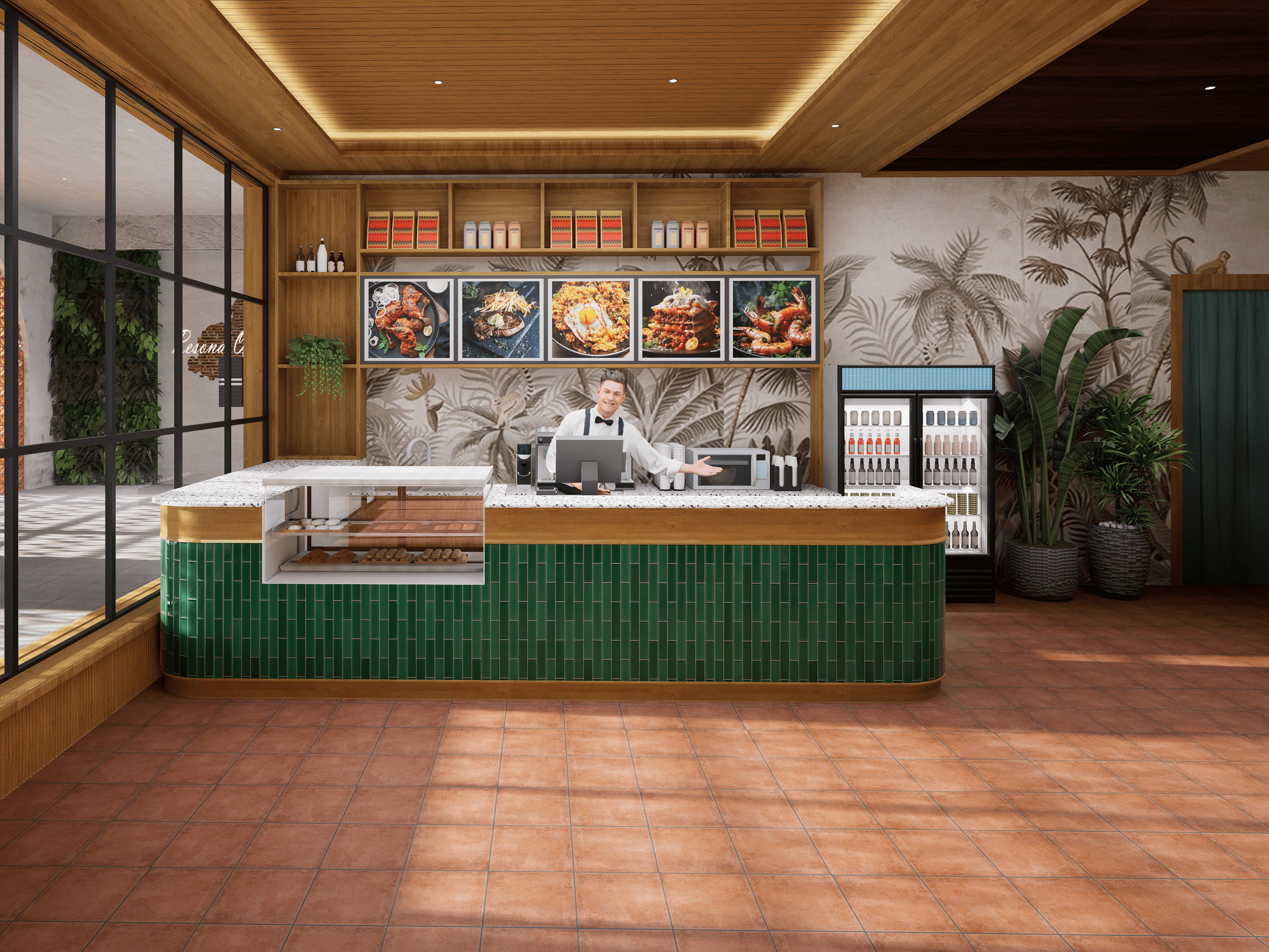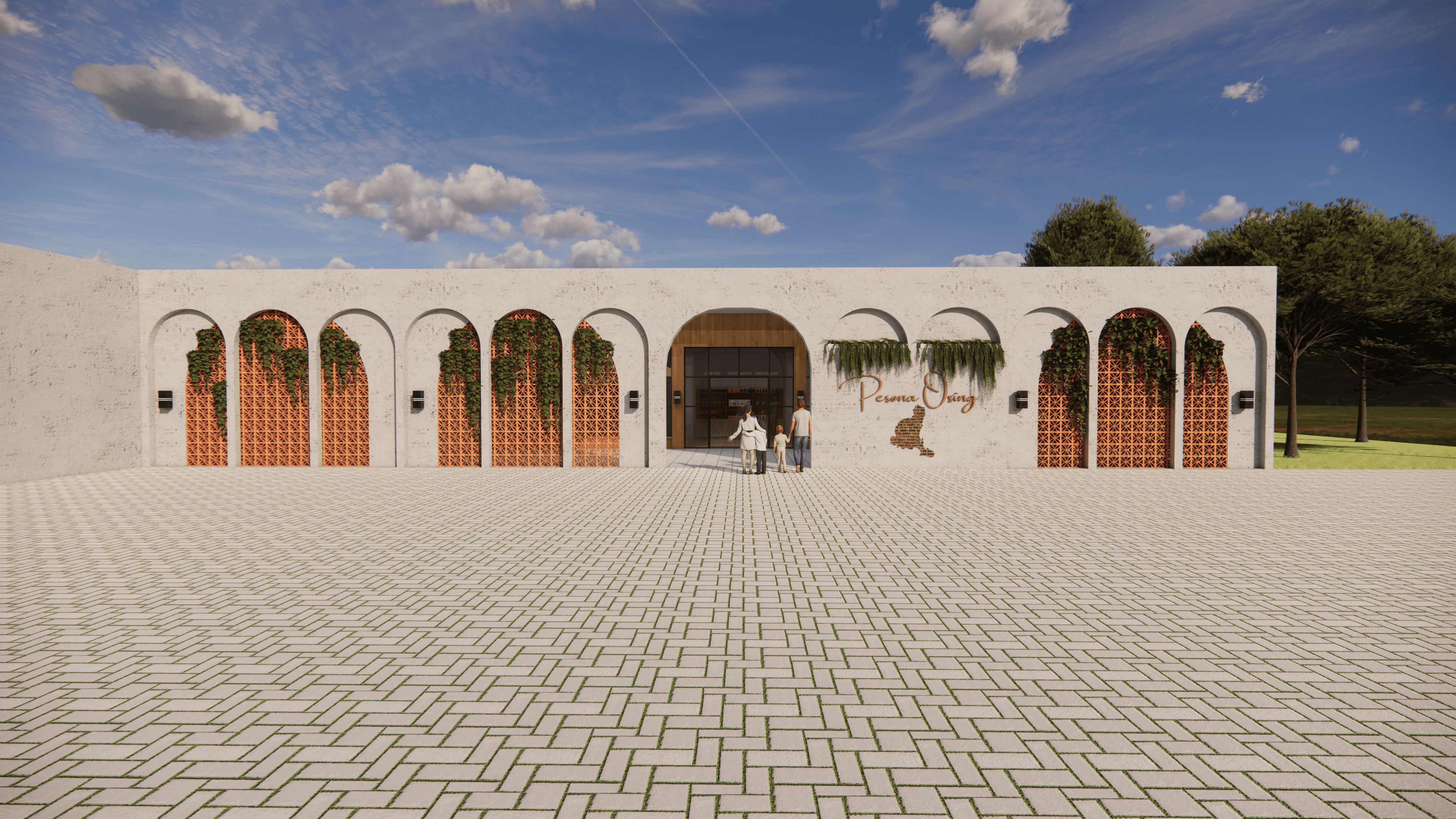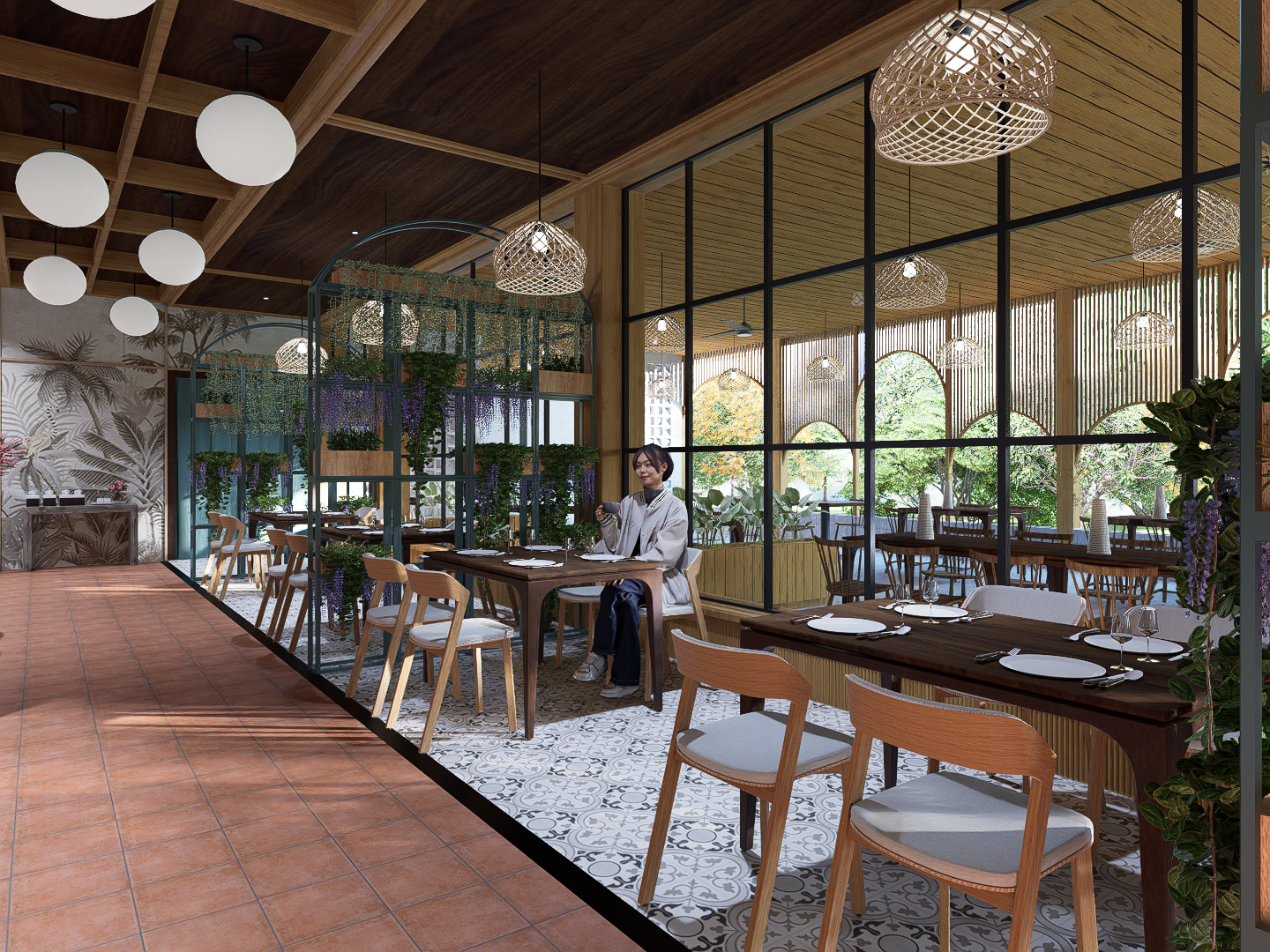 Restoran merupakan sebuah fasilitas komersial yang menyediakan layanan makanan dan minuman kepada pelanggan. Dalam era globalisasi ini, perkembangan industri kuliner mengakibatkan persaingan bisnis restoran semakin ketat. Oleh karena itu, desain interior kafe dan restoran harus didukung dengan visual yang mampu menarik perhatian konsumen untuk berkunjung dan berbelanja. Pesona Osing adalah restoran keluarga yang berlokasi di Banyuwangi, yang menawarkan suasana alami sejuk dengan kebun buah tropis seperti mangga, durian, alpukat, dan buah naga. Pokok masalah dalam redesain ini adalah bagaimana merancang interior Pesona Osing café dan resto dengan suasana kebun buah. Metode yang digunakan adalah design thinking dengan tahapan: inspiration (understand, observe, POV), ideation (ideate, prototype, test), dan implementation (storytelling, pilot, business model). Redesain ini menggunakan pendekatan biophilic dengan memasukkan unsur alam ke dalam interior ruangan, baik secara nyata maupun sebagai representasi alam. Hasil redesain ini diharapkan dapat memperkaya pengalaman kuliner para pengunjung serta memberikan daya tarik tambahan bagi industri kuliner di Banyuwangi.
