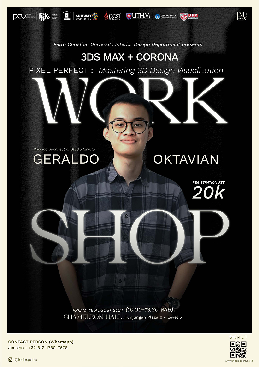 Dalam Rangka Memeriahkan acara INDEX 2024, diadakan Workshop 3DS Max + Corona. Acara workshop ini diadakan pada Jumat 16 Agustus 2024 di Chameleon Hall TP 6 lantai 5. Dengan narasumber Geraldo Oktavian.