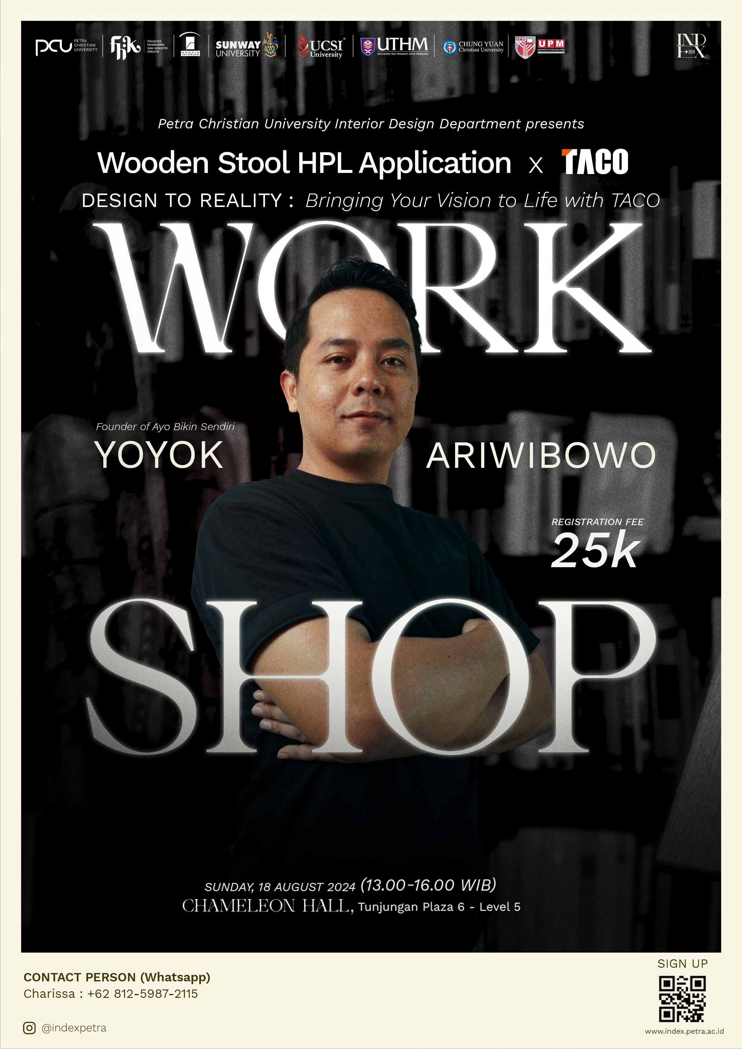 Dalam Rangka Memeriahkan acara INDEX 2024, diadakan Workshop wooden stool HPL application. Acara workshop ini diadakan pada Minggu 18 Agustus 2024 di Chameleon Hall TP 6 lantai 5. Dengan narasumber Yoyok Ariwibowo.