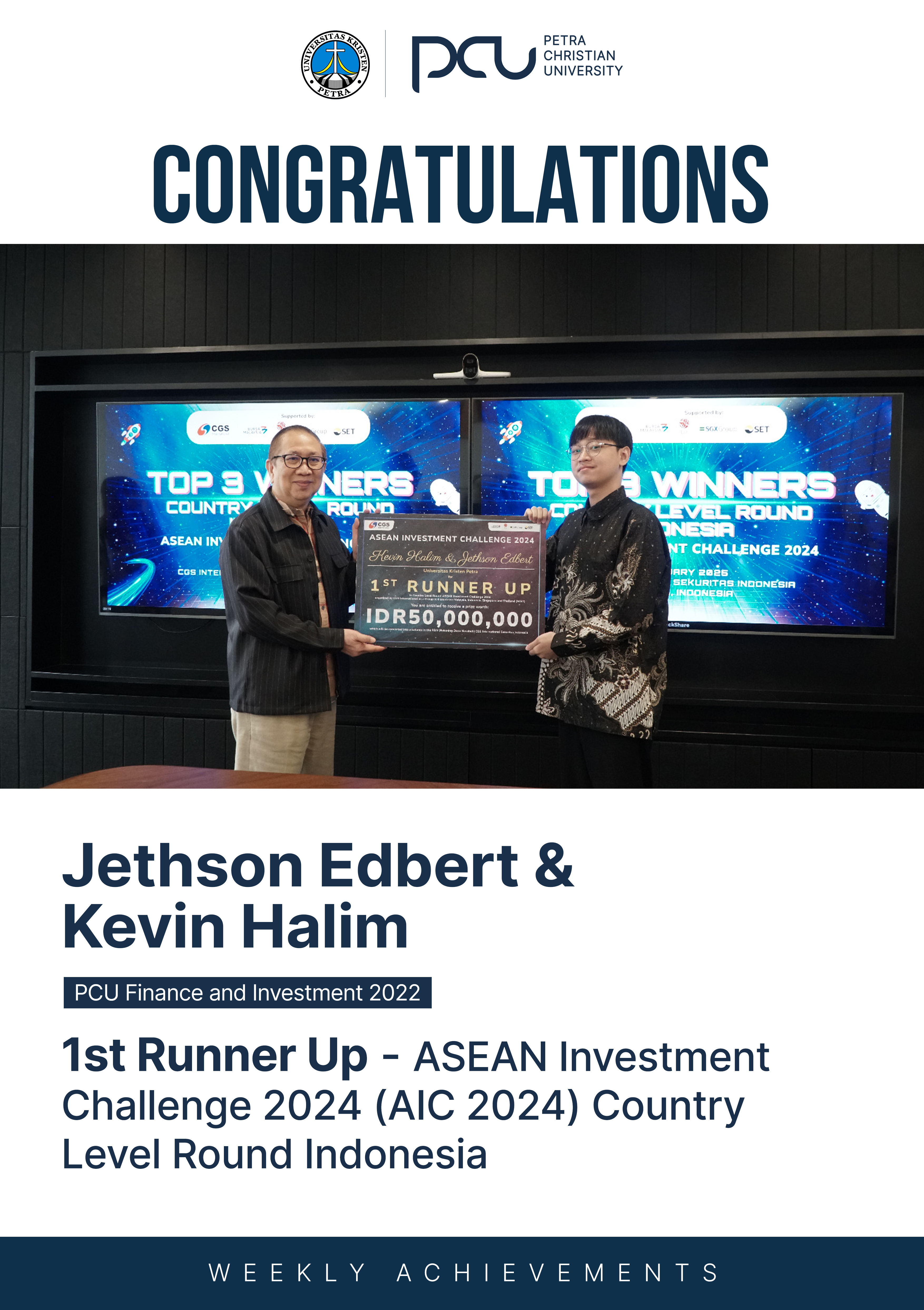 Selamat atas prestasi yang diraih oleh Jethson Edbert dan Kevin Halim sebagai 1st Runner Up dalam ASEAN Investment Challenge 2024 (AIC 2024) Country Level Round Indonesia