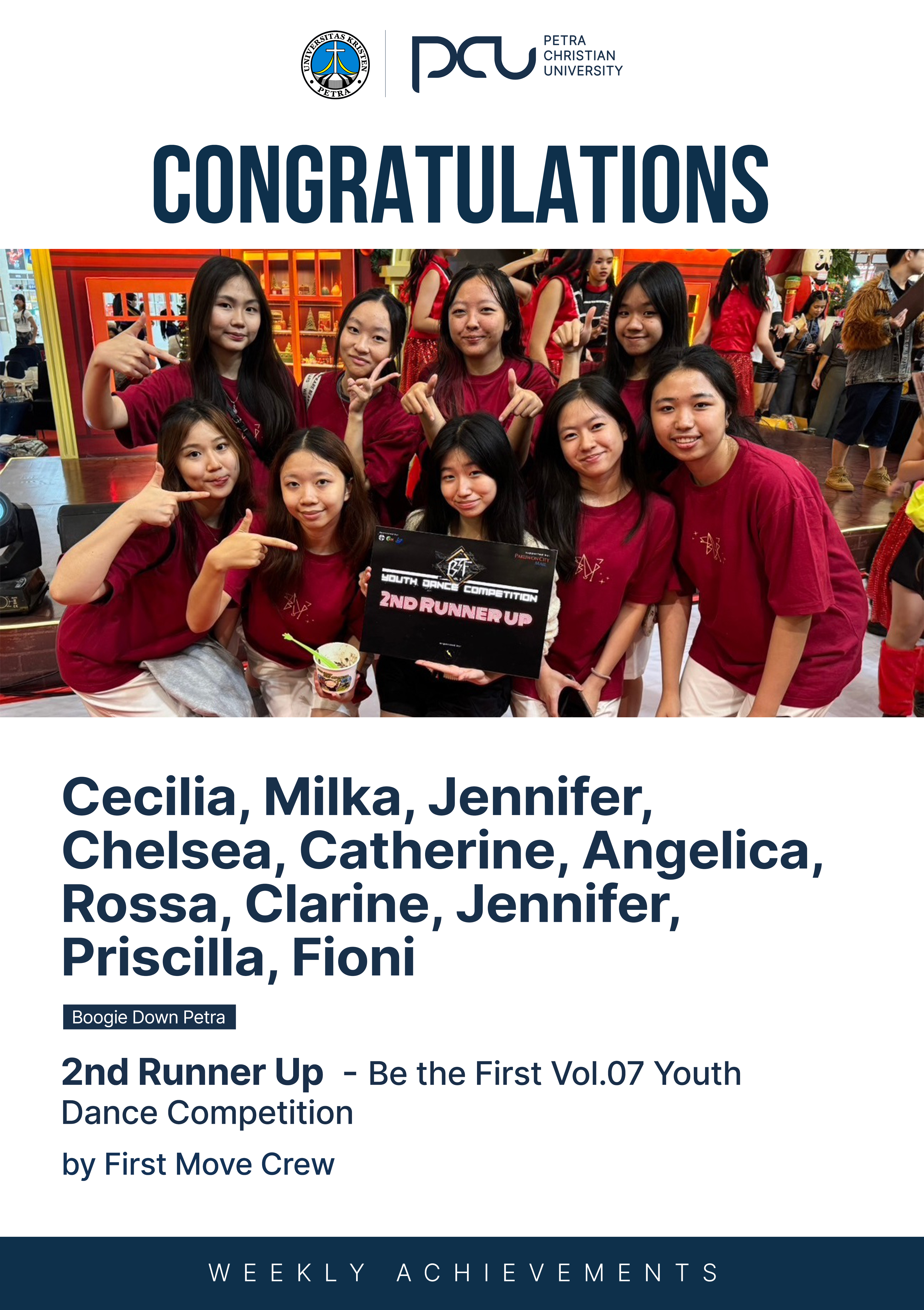 Selamat atas prestasi yang diraih oleh Cecilia, Milka, Jennifer, Chelsea, Catherine, Angelica, Rossa, Clarine, Jennigfer, Priscilla, Fioni sebagai 2nd Runner Up dalam Be the First Vol.07 Youth Dance Competition by First Move Crew
