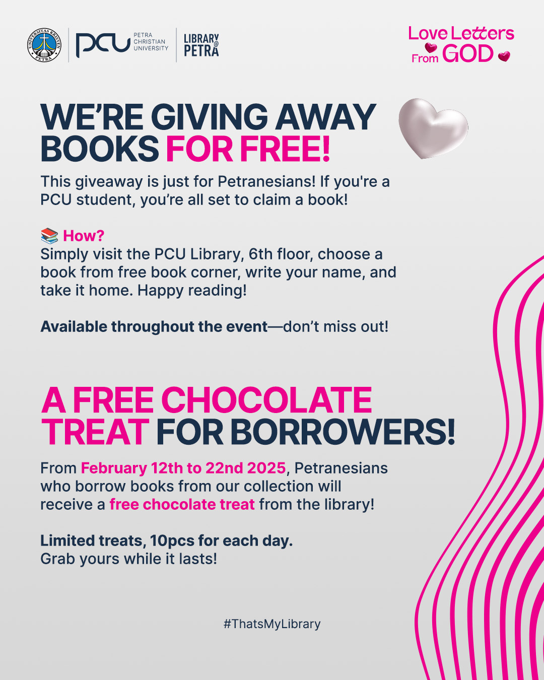 Dalam rangka menyambut kedatangan mahasiswa pada semester genap tahun 2025, Perpustakaan UK Petra mengadakan beberapa acara yang menarik. Salah satunya adalah pemberian buku gratis bagi yang berminat. Acara dimulai pada tanggal 12 Februari 2025 hingga 22 Februari 2025.