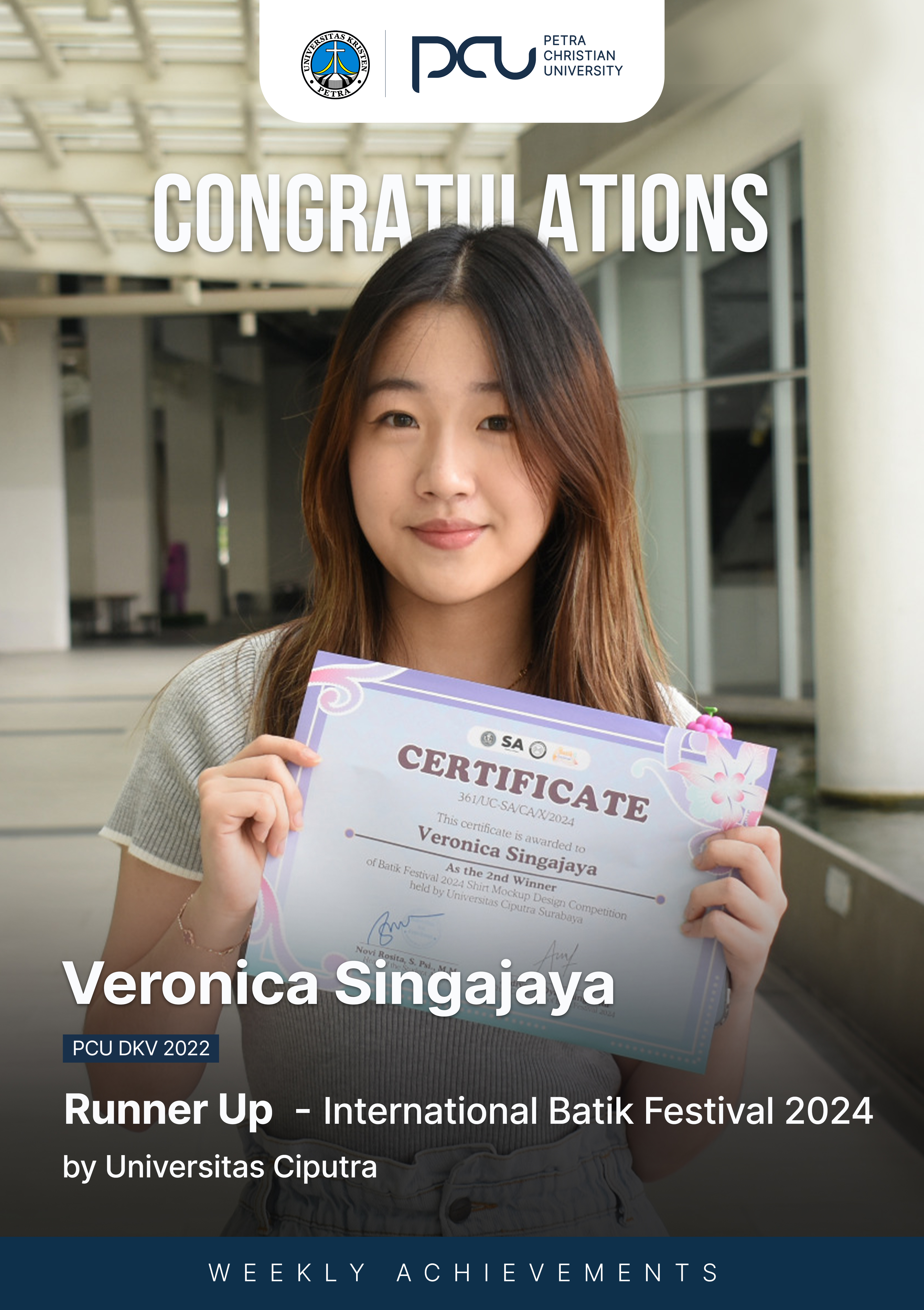 Selamat atas prestasi yang diraih oleh Veroniva Singajaya sebagai Runner Up International Batik Festival 2024 by Universitas Ciputra Surabaya