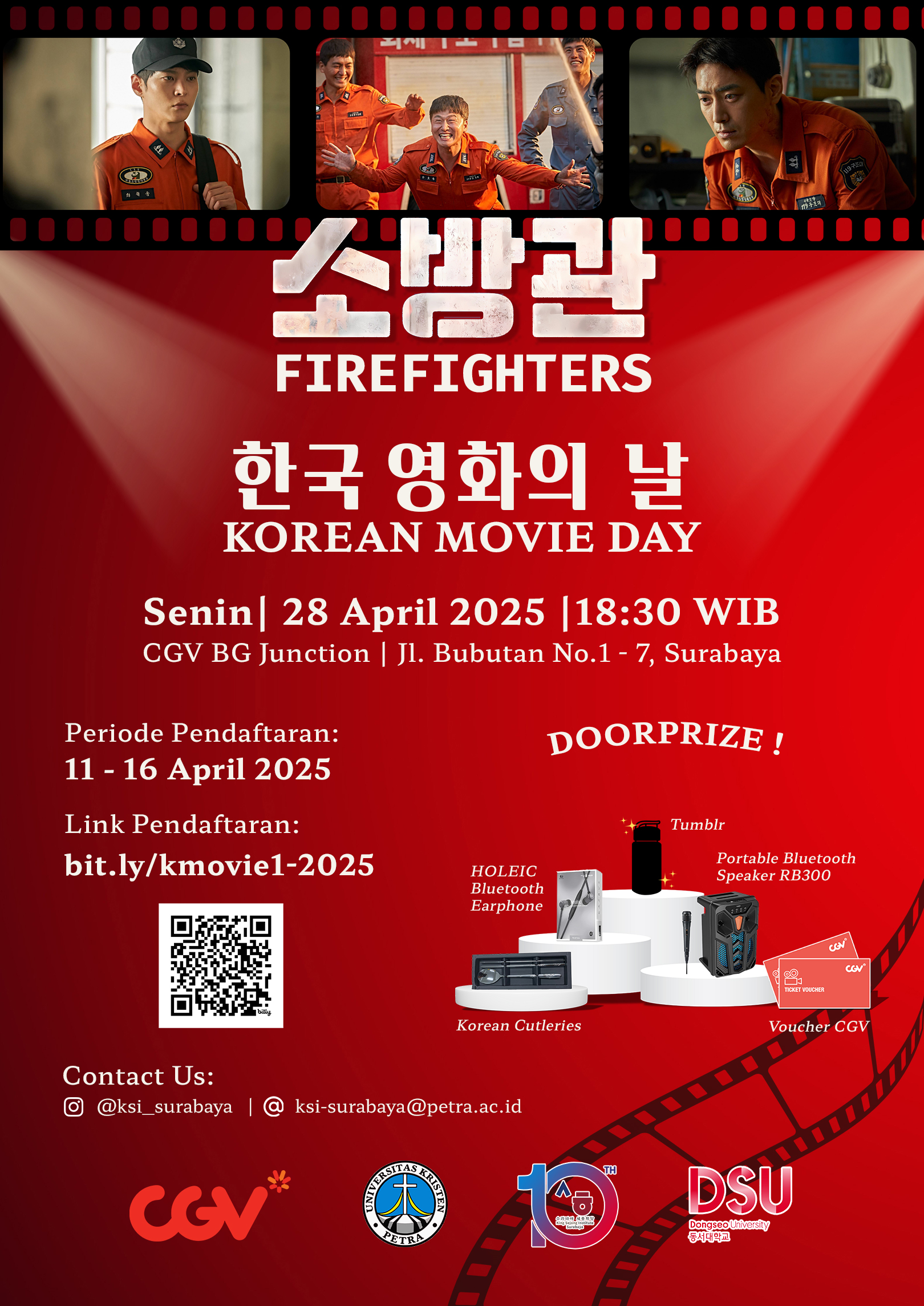 Suatu event budaya yang merupakan hasil kerjasama KSI Surabaya dengan CGV BG Junction Surabaya untuk memperkenalkan budaya dan bahasa Korea melalui film Korea.Kali ini akan diputarkan film “소방관 | Firefighters” yang mengisahkan tentang perjuangan para petugas pemadam kebakaran dalam menghadapi bencana besar dan mengorbankan diri untuk menyelamatkan jiwa orang lain. Film ini juga terinspirasi dengan kisah nyata akan tragedi Hongje-dong, Seoul di tahun 2001. Acara nonton film ini diselenggarakan pada Senin, 28 April 2025.