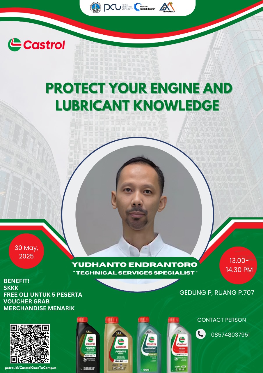 Program Studi Teknik Mesin mengadakan workshop dengan topik "protect your engine and lubricant knowlegde". Acara ini diselenggarakan pada 30 Mei 2025 jam 13.00 - 14.30 WIB bertempat di ruang P.707. dengan narasumber Yudhanto Endrantoro.