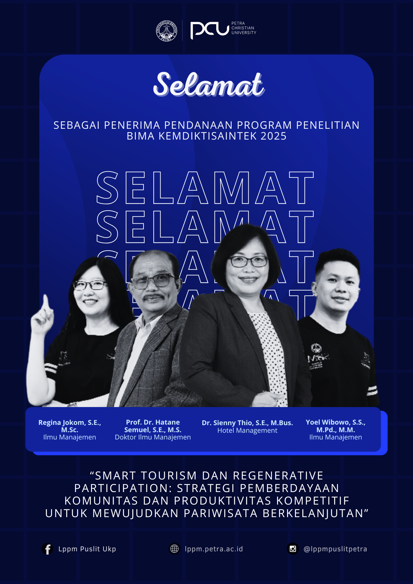 Selamat atas prestasi yang diraih oleh Regina Jokom, M.Sc., Prof. Dr. Hatane Semuel., Dr. Sienny Thio., Yoel Wibowo, M.M.