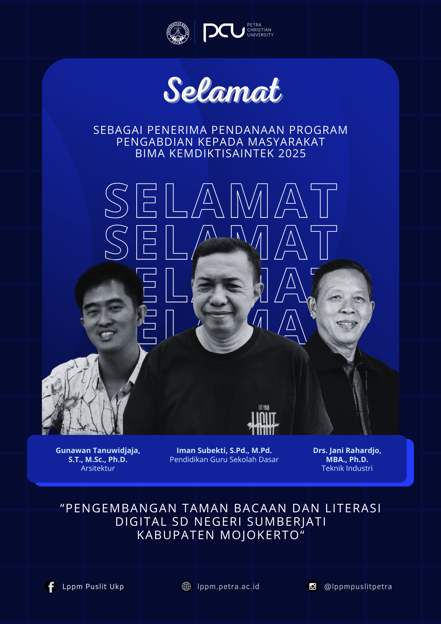 Selamat atas prestasi yang diraih oleh Gunawan Tanuwidjaja, Ph.D., Iman Subekti M.Pd., Jani Rahardjo, Ph.D.