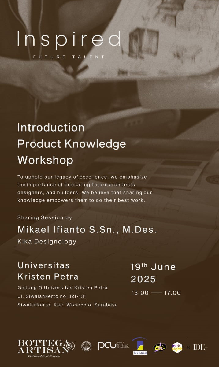 Workshop tentang desain interior dan arsitektur akan diselenggarakan oleh Program Studi Desain Komunikasi Visual UK Petra pada 19 Juni 2025 jam 13.00 - 17.00 WIB bertempat di Gedung Q. Dengan narasumber Mikael Ifianto, S.Sn., M.Des.