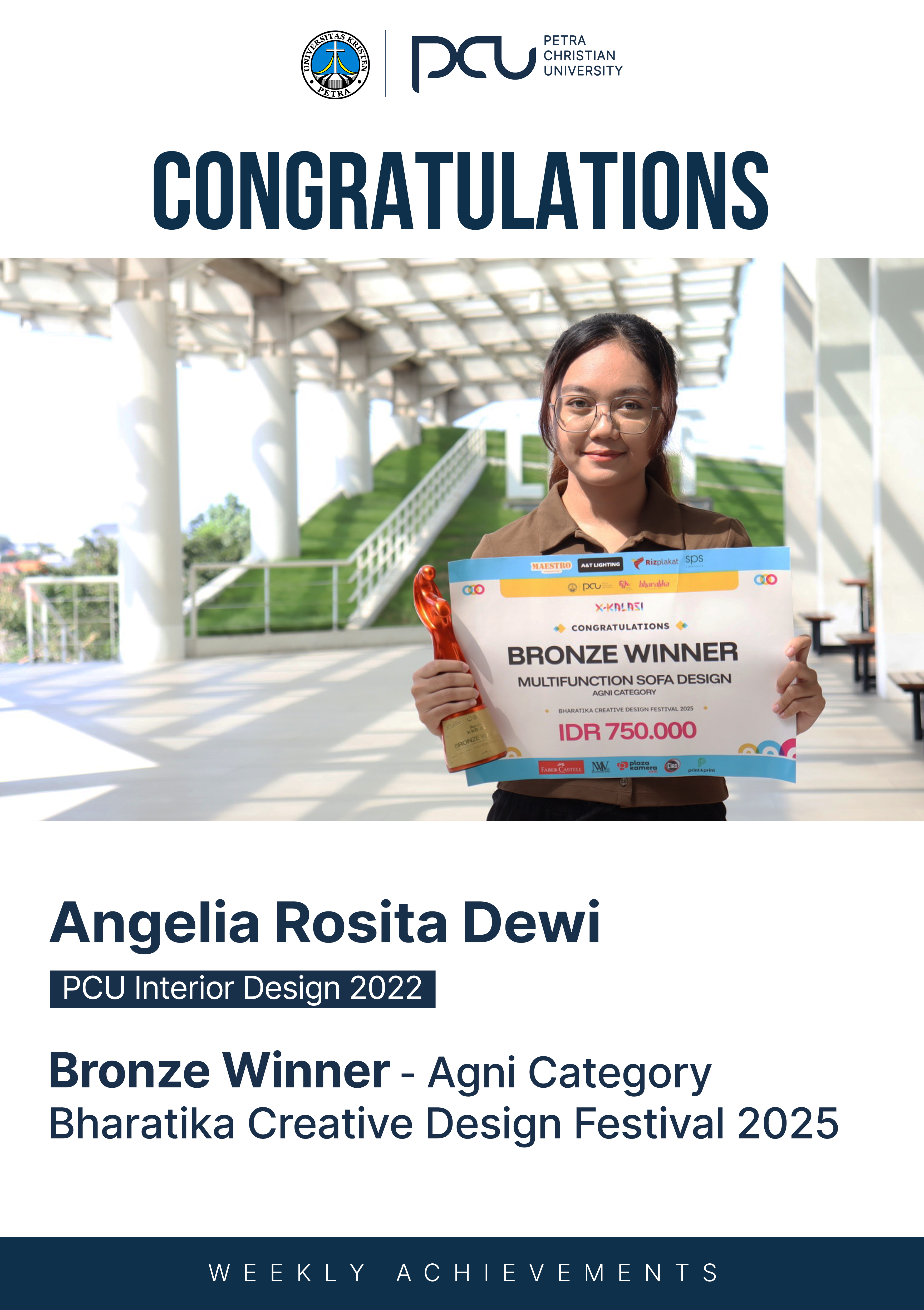 Selamat atas prestasi yang diraih Angelia Rosita Dewi sebagai Bronze Winner dalam Agni Category Bharatika Creative Design Festival 2025 by Petra Christian University