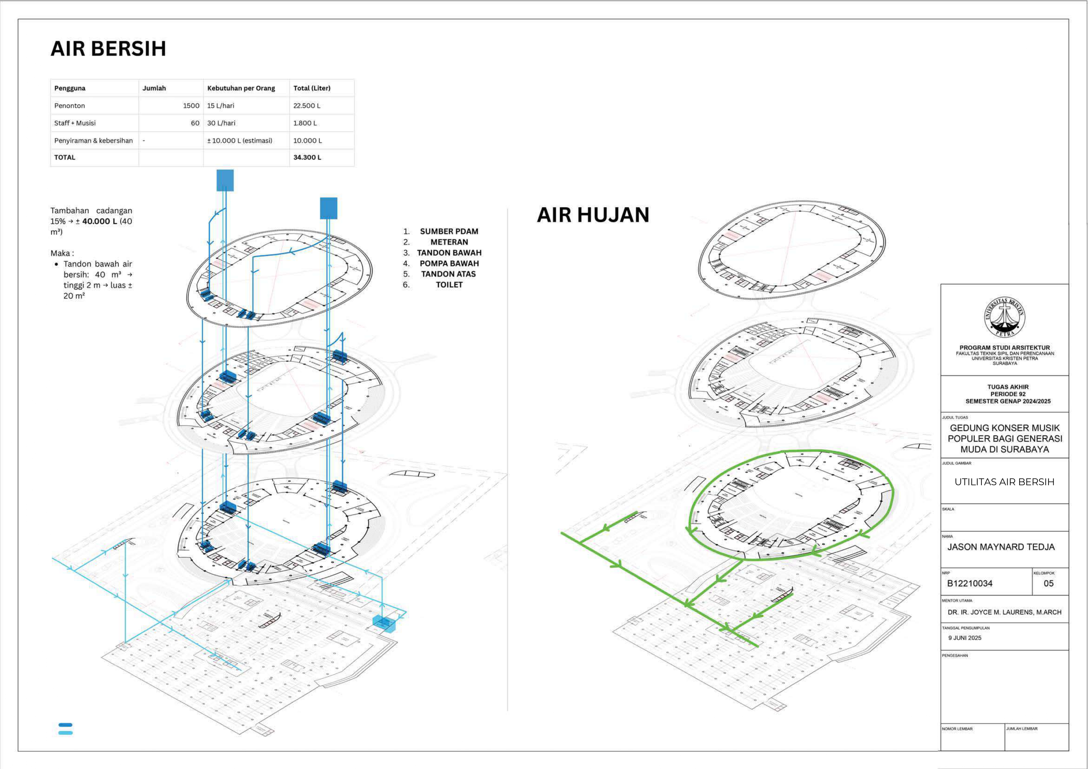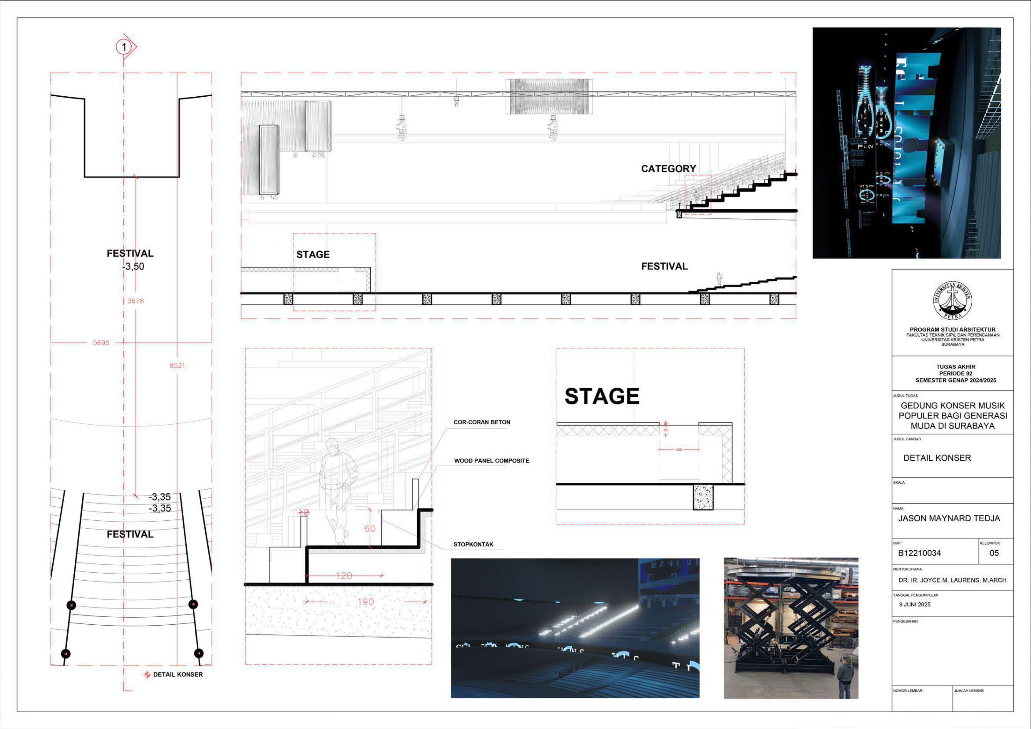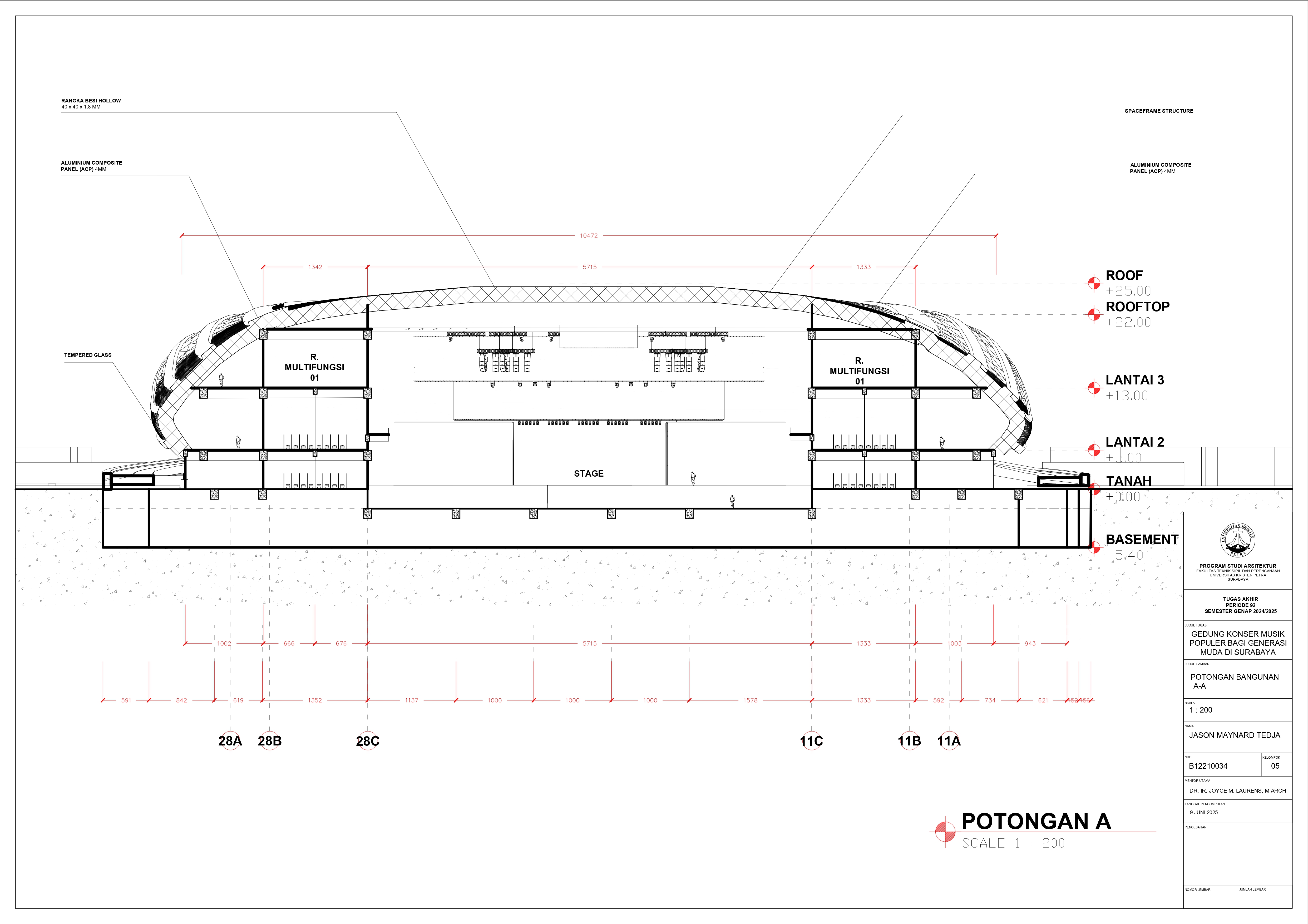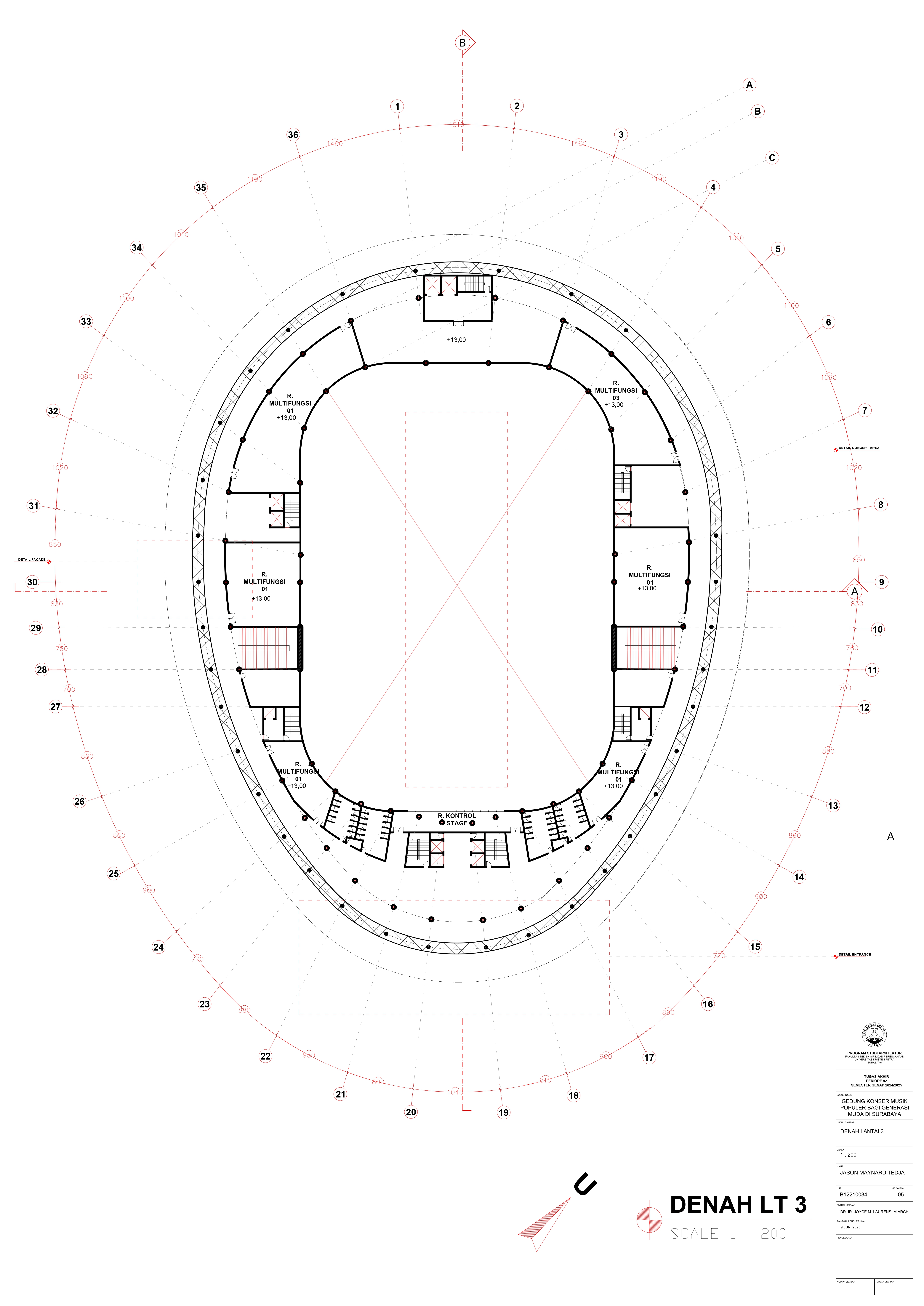 JASON MAYNARD TEDJA Joyce M.Laurens (Advisor 1); Elvina Shanggrama Wijaya, S.T., M.T. (Examination Committee 1); Aris Budhiyanto, S.T., M.Sc., Ph.D. (Examination Committee 2); Roni Anggoro, S.T., M.A.Arch. (Examination Committee 3); Luciana Kristanto, S.T., M.T. (Examination Committee 4); Dr. Feny Elsiana, S.T., M.T. (Examination Committee 5) Universitas Kristen Petra Indonesian Digital Theses Undergraduate Thesis Laporan Perancangan Arsitektur Laporan Perancangan Arsitektur No. 00024653/ARS/2025; Jason Maynard Tedja (B12210034) CONSERVATORIES OF MUSIC; MUSIC-HALLS--DESIGNS AND PLANS