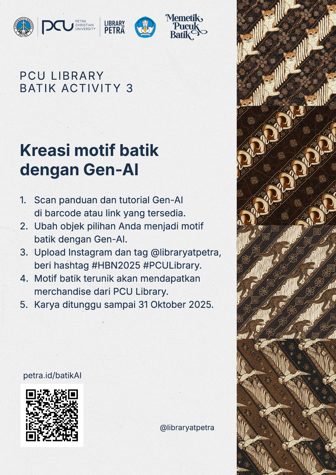 Perpustakaan UK Petra dalam rangka Hari Batik Nasional, mengadakan acara membuat pola (motif) batik menggunakan teknologi AI (Gemini). Kemudian hasil karya diupload di instagram dan tag @libraryatpetra dan beri hastag #HBN2025 #PCULibrary