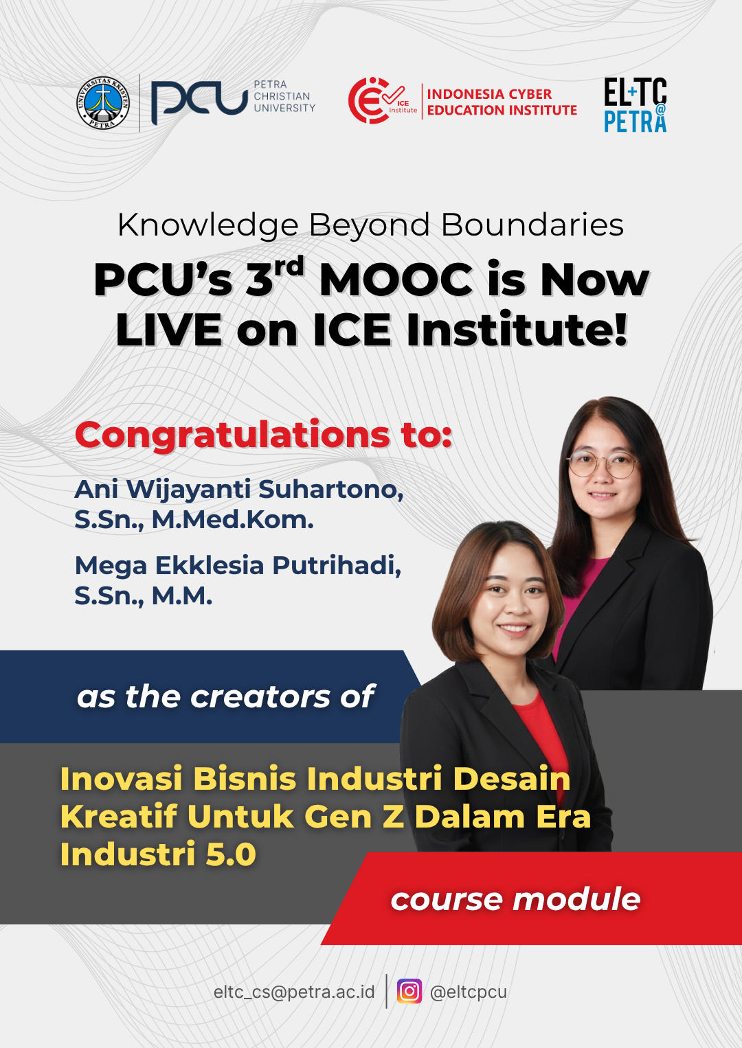 Selamat buat Ani Wijayanti Suhartono, S.Sn.,M.Med.Kom., Dan Mega Ekklesia Putrihadi, S.Sn., M.M., atas prestasinya yang telah membuat modul pembelajaran Inovasi Bisnis Industri Desain Kreatif Untuk Gen Z Dalam Era Industri 5.0