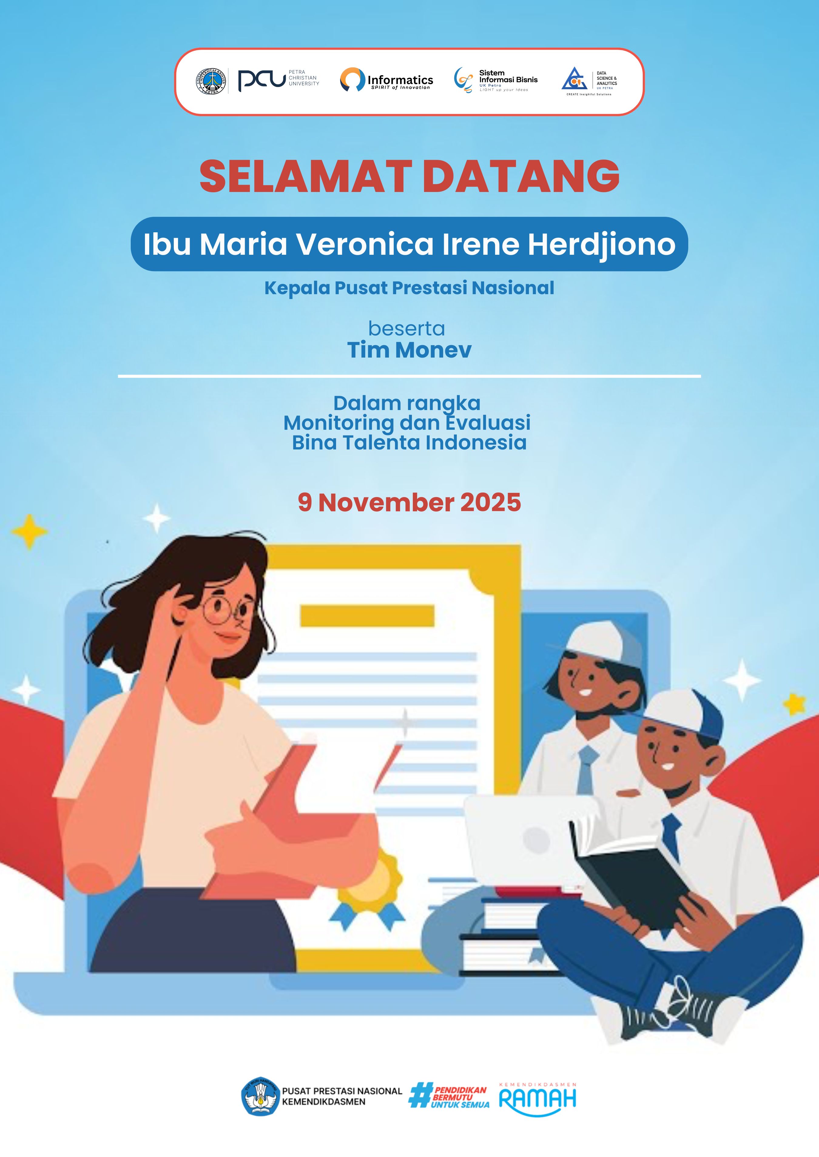 Selamat datang ibu Maria Veronica Irene Herdjiono beserta tim, dalam rangka Monitoring dan Evaluasi bina talenta Indonesia di Program Studi Teknik Informatika UK Petra pada 09 Oktober 2025.