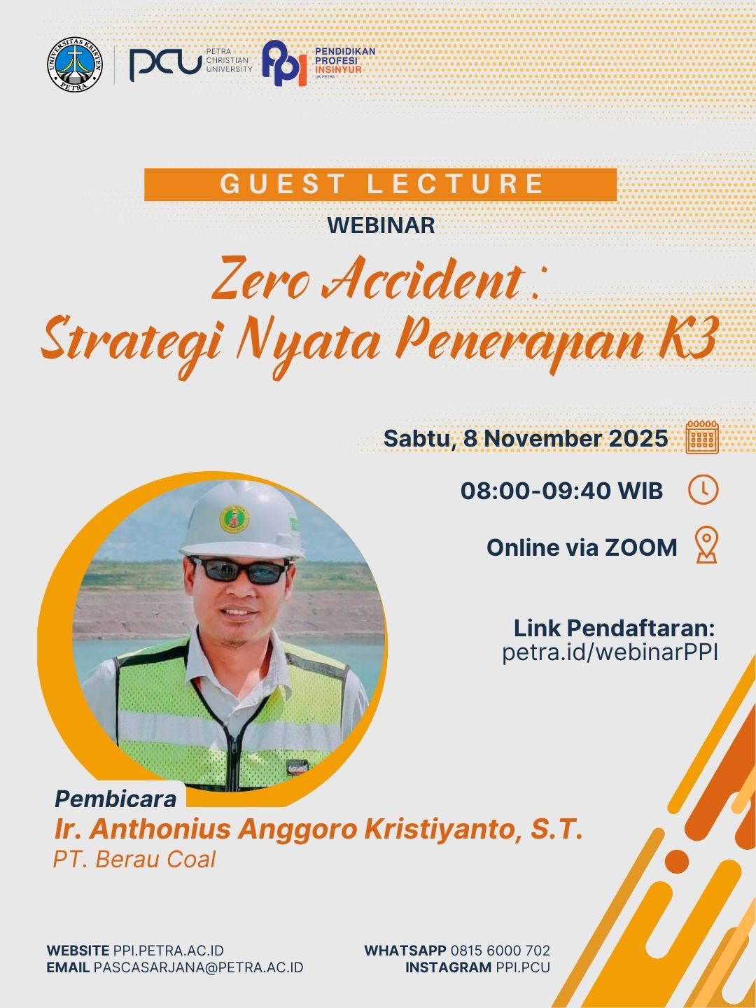 Program Pendidikan Profesi Insinyur Universitas Kristen Petra Surabaya pada Sabtu, 08 November 2025, jam 08.00 – 09.40 WIB mengadakan acara Webinar dengan topik Zero Accident: Strategi Nyata Penerapan K3. Bersama Ir. Anthonius Anggoro Kristiyanto, S.T. dari PT. Berau Coal. Via Zoom