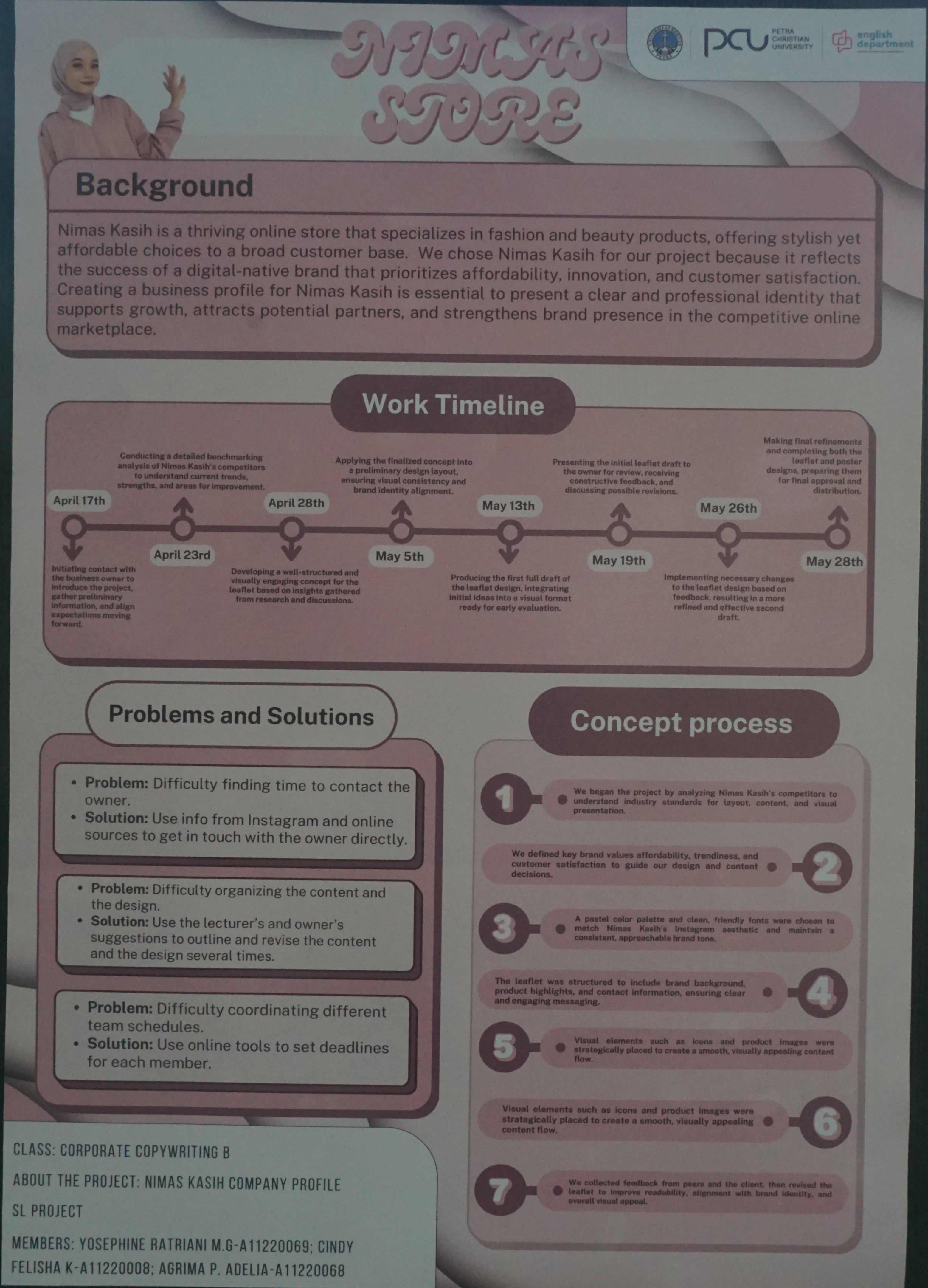 Poster ini dibuat untuk final project exhibition dari mahasiswa Program Studi English for Creative Industry. Salah satu materi pameran adalah Company Profile Nimas Kasih Online Store.