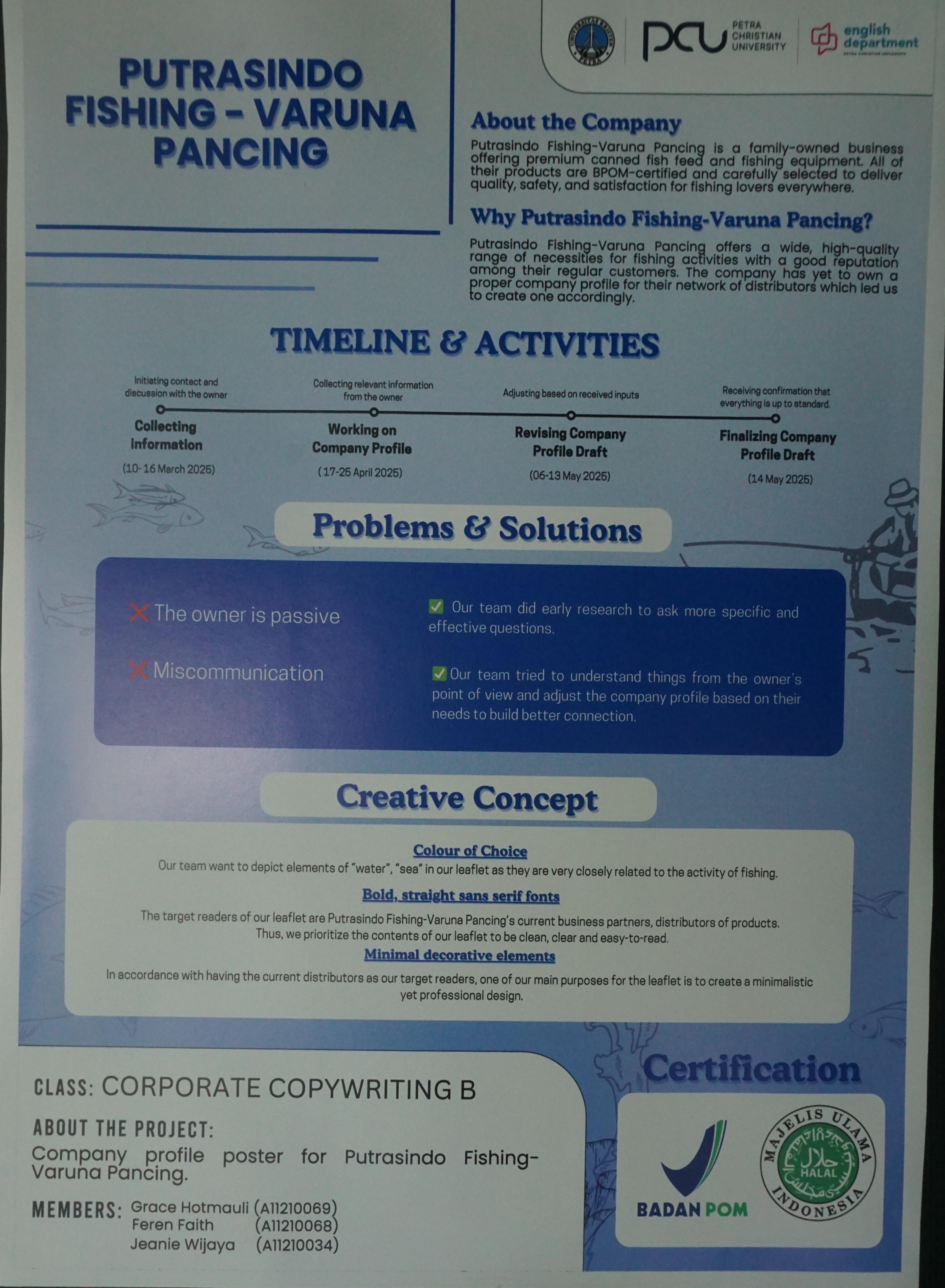 Poster ini dibuat untuk final project exhibition dari mahasiswa Program Studi English for Creative Industry. Salah satu materi pameran adalah Company Profile Putrasindo fishing - Varuna pancing.