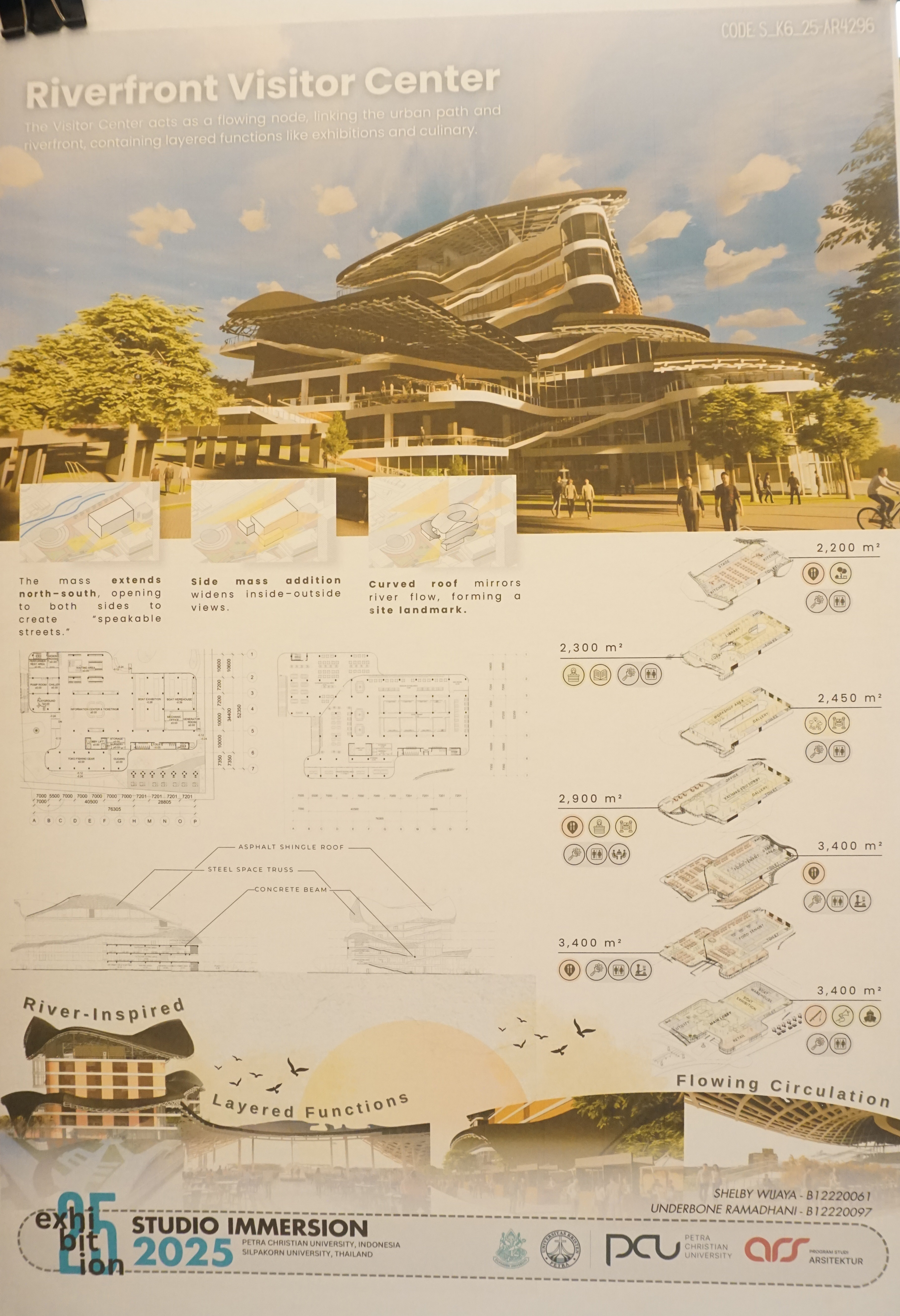 Salah satu karya yang dipamerkan adalah Riverfront visitor center karya dari Shelby Wijaya (B12220061) serta Underbone Ramadhani (B12220097)
